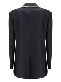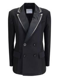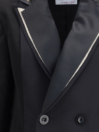 double-breasted jacket Highlights - Black - Double-breasted closure - Satin trim - Peak lapels - Long sleeves - Wool blend Imported Composition Polyester 55%, Wool 45% Washing instructions Read Manufacturer Guidelines