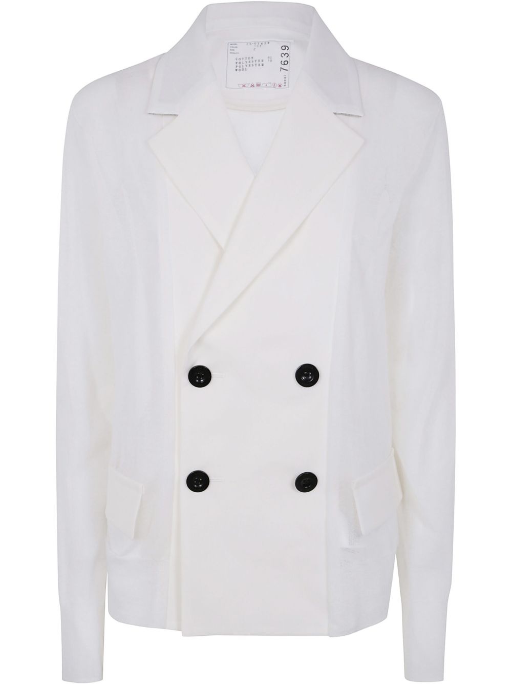 double-breasted jacket Highlights - White - Double-breasted button fastening - Two side flap pockets - Peak lapels - Long sleeves Imported Composition Polyester 100% Washing instructions Read Manufacturer Guidelines