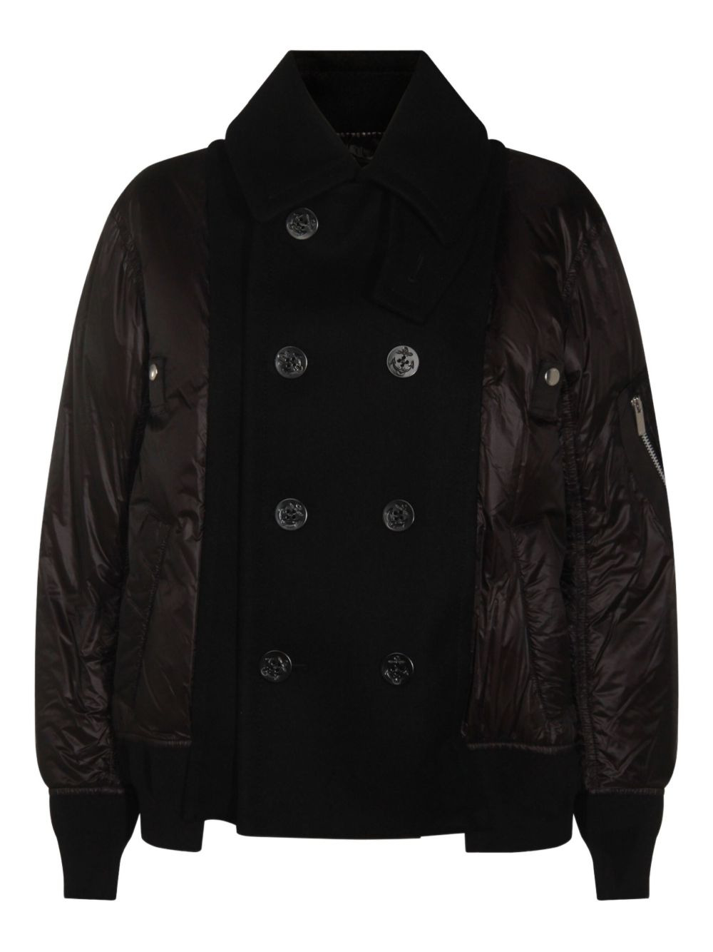 double-breasted puffer jacket Highlights - Black - Wool panel - Quilted design - Double-breasted - Button fastening - Side pockets Imported Composition Lining: Nylon 100%, Goose Down 90%, Goose Feather 10% Outer: Polyester 100%, Wool 100% Washing instructions Read Manufacturer Guidelines