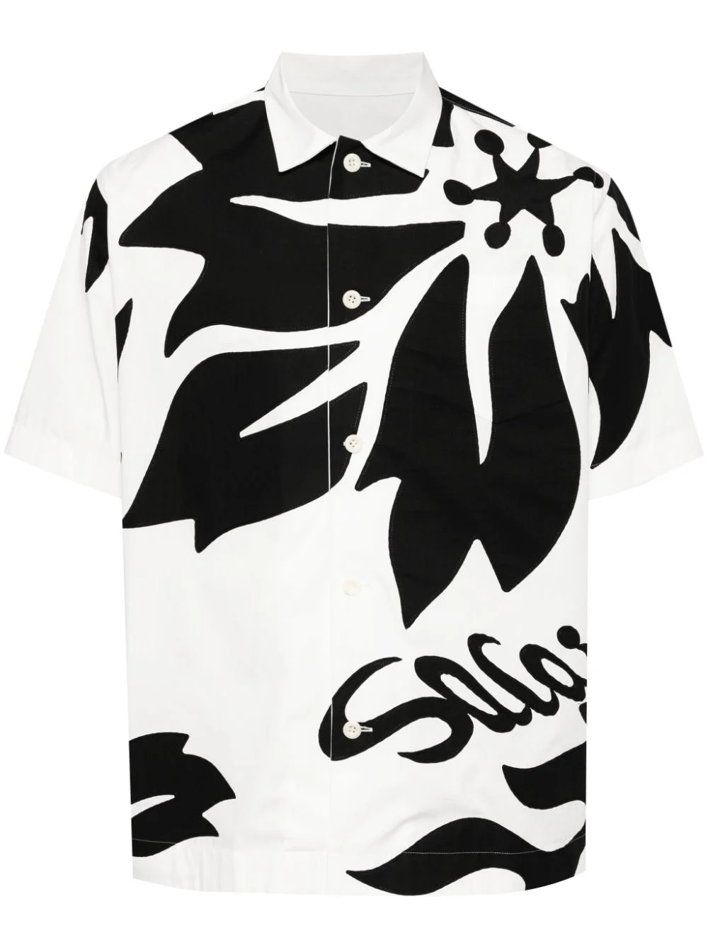 floral-print shirt Highlights - White/black - Cotton blend - Poplin texture - Logo patches to the front - Floral patches motif - Spread collar - Drop shoulder - Short sleeves - Chest patch pocket - Short side slits - Front button fastening Imported Composition Polyester 65%, Cotton 35% SIZE & FIT Model measurements Height 6 ft 2 in(1.87 m) Bust/Chest 37.4 in(95 cm) Hips 37 in(94 cm) Waist 31.49 in(80 cm) FittingInformation Designed to be unstructured, offering a loose fit throughout Made from a midweight non-stretch fabric This piece fits true to size – take your usual size