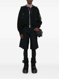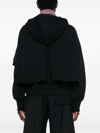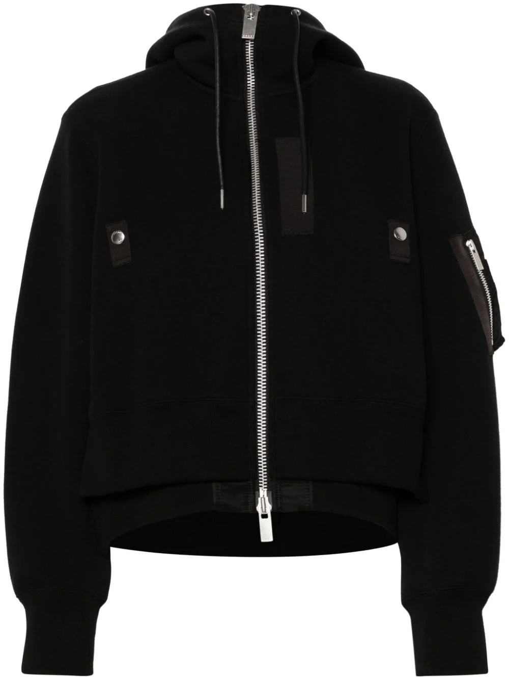 layered-detail hooded bomber jacket Highlights - Black - Cotton blend - Jersey texture - Layered details - Drawstring hood - Long sleeves - Ribbed cuffs and hem - Sleeve zip pocket - Side slits - Two side welt pockets - Full lining - Straight hem - Front two-way zip fastening Imported Composition Outer: Nylon 100%, Cotton 62%, Polyester 38% Lining: Polyester 100% SIZE & FIT Model measurements Height 5 ft 10 in(1.77 m) Bust/Chest 32.28 in(82 cm) Hips 35.03 in(89 cm) Waist 25.19 in(64 cm) FittingInformation Designed to be unstructured, offering a loose fit throughout The ribbed hem offers a close, comfortable fit Made from a midweight fabric This piece fits true to size – take your usual size
