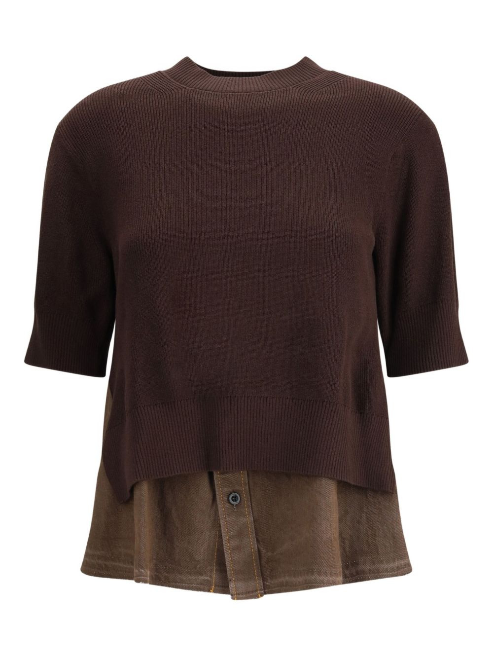 layered knit sweater Highlights - Brown - Short sleeves - Round neck - Layered design - Denim shirt overlay Imported Composition Cotton 57%, Polyester 43% Washing instructions Read Manufacturer Guidelines