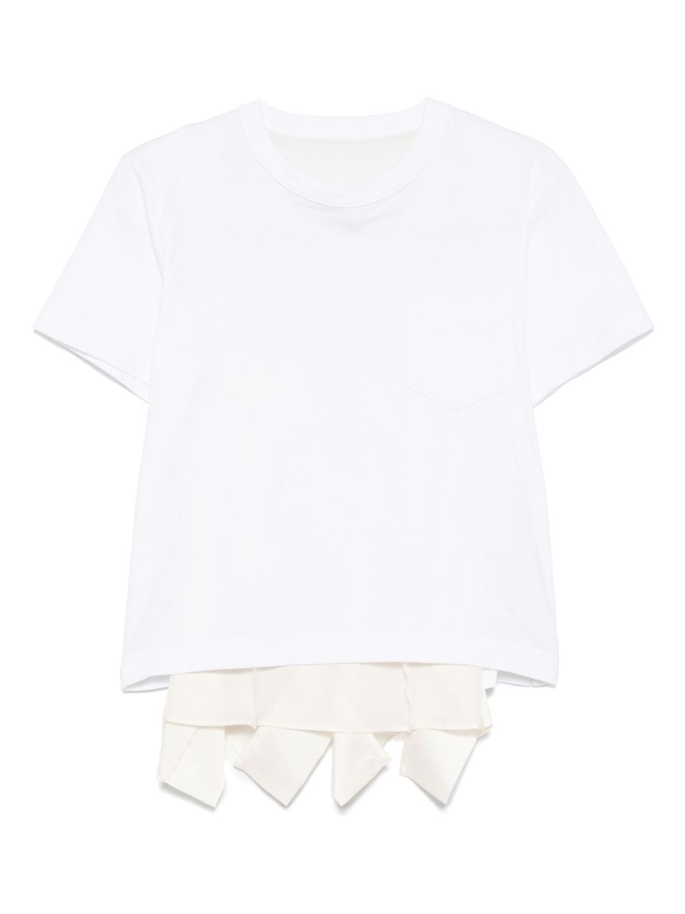 layered T-shirt Highlights - White - Crew neck - Short sleeves - Chest patch pocket - Asymmetric hem Imported Composition Polyester 100%, Cotton 100% SIZE & FIT Model measurements Height 5 ft 11 in(1.8 m) Bust/Chest 31.49 in(80 cm) Hips 35.82 in(91 cm) Waist 24.8 in(63 cm) Measurement SLEEVE LENGTH 11.81 in(30 cm) LENGTH 24.4 in(62 cm) WAIST 43.3 in(110 cm) BUST 39.37 in(100 cm) Shoulder Width 16.53 in(42 cm) FittingInformation Designed to be unstructured, offering a loose fit throughout Made from a midweight non-stretch fabric, this piece offers minimal elasticity when worn Washing instructions Dry Clean Only