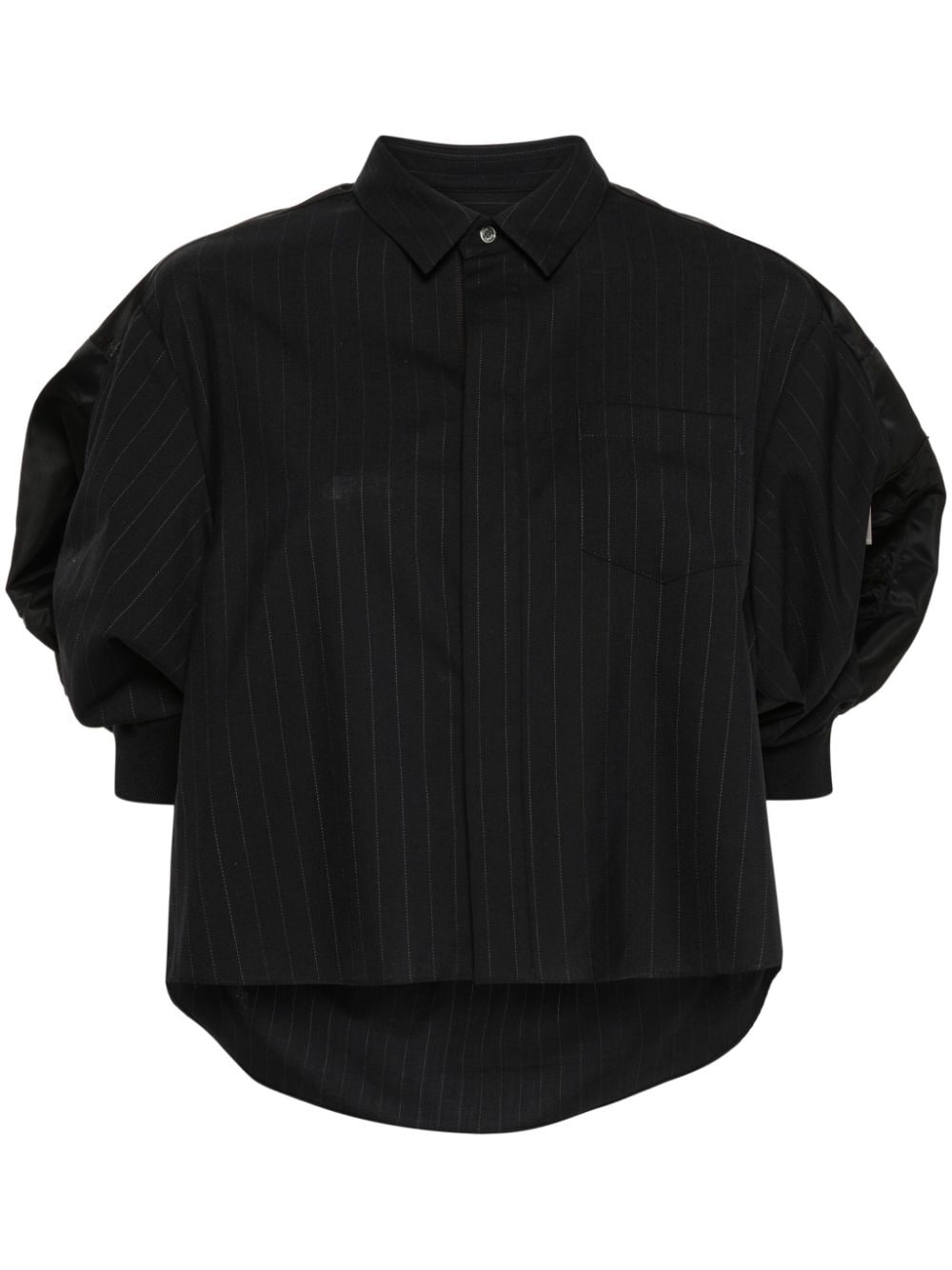 pinstripe cropped shirt Highlights - Navy blue - Pinstripe pattern - Panelled design - Box-pleat detail to the rear - Logo-engraved buttons - Branded zip puller - Classic collar - Drop shoulder - Short puff sleeves - Ribbed cuffs - Chest patch pocket - Sleeve zip pocket - Cropped - Front button fastening - Curved hem - Partial mesh lining Imported Composition Outer: Polyester 70%, Wool 30% Lining: Polyester 100% SIZE & FIT Model measurements Height 5 ft 11 in(1.8 m) Bust/Chest 33.07 in(84 cm) Hips 37 in(94 cm) Waist 25.59 in(65 cm) FittingInformation Designed to be unstructured, offering a loose fit throughout Made from a midweight non-stretch fabric This piece fits true to size – take your usual size Washing instructions Dry Clean Only