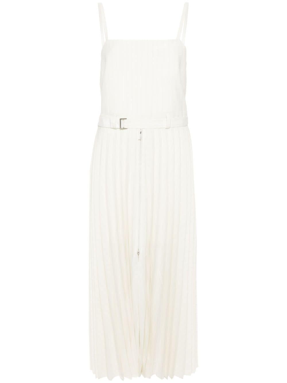 pinstriped pleated maxi dress Highlights - Cream white - Pinstripe pattern - Adjustable shoulder straps - Sleeveless - Square neck - Faux pocket detail to the chest - Belt loops - Detachable and adjustable waist belt - Pleated skirt - Ankle-length - Adjustable strap to the rear - Partial lining - Straight hem - Short front zip fastening Imported Composition Outer: Polyester 70%, Wool 30% Lining: Cupro 100% SIZE & FIT Model measurements Height 5 ft 10 in(1.78 m) Bust/Chest 32.67 in(83 cm) Hips 35.43 in(90 cm) Waist 23.22 in(59 cm) FittingInformation Designed to be unstructured, offering a loose fit throughout The adjustable shoulder straps allow for a preferred fit when worn Made from a midweight non-stretch fabric This piece fits true to size – take your usual size