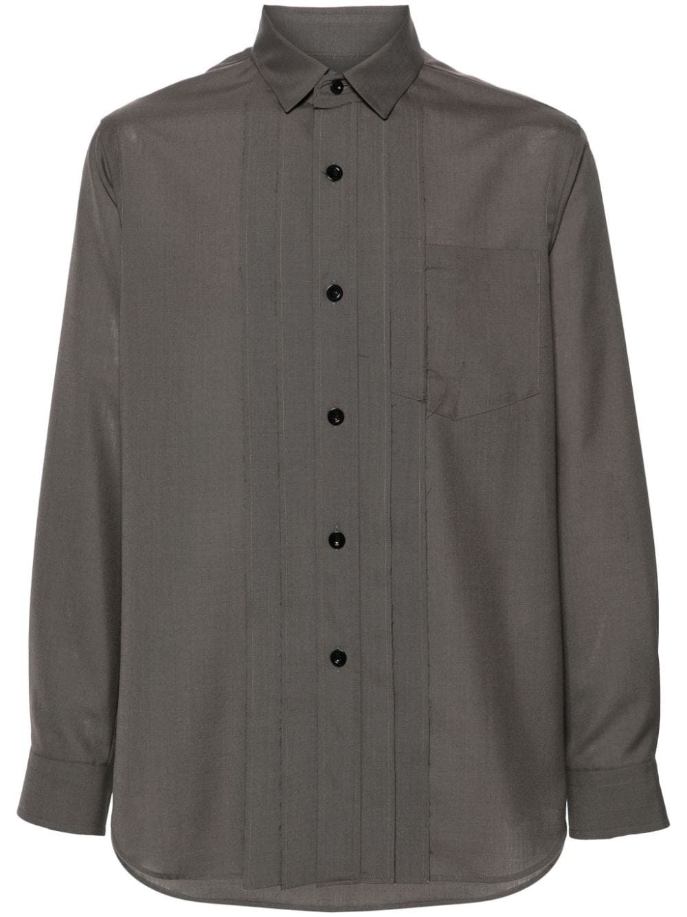 pleated button-up shirt Highlights - Taupe - Pleat detailing - Classic collar - Front button fastening - Long sleeves with buttoned cuffs - Chest patch pocket - Curved hem Imported Composition Polyester 70%, Wool 30% SIZE & FIT Model measurements Height 6 ft 2 in(1.89 m) Bust/Chest 39.76 in(101 cm) Hips 37.4 in(95 cm) Waist 29.92 in(76 cm) FittingInformation Designed for a regular fit, allowing for a comfortably loose fit throughout the body Made from a midweight non-stretch fabric This piece fits true to size – take your usual size
