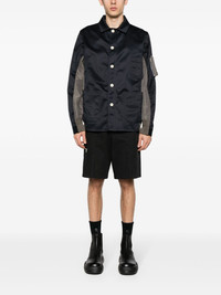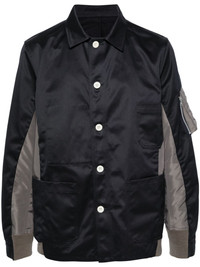 spread-collar panelled shirt jacket Highlights - Navy blue/grey - Gabardine weave - Panelled design - Ribbed panelling - Spread collar - Front button fastening - Side zip fastening - Long sleeves - Sleeve zip pocket - Chest patch pocket - Two front patch pockets - Straight hem - Unlined Imported Composition Outer: Nylon 100%, Cotton 100%, Acrylic 60%, Wool 40% Lining: Polyester 100% SIZE & FIT Model measurements Height 6 ft 2 in(1.87 m) Bust/Chest 36.41 in(92.5 cm) Hips 35.43 in(90 cm) Waist 29.52 in(75 cm) FittingInformation Designed to be unstructured, offering a loose fit throughout Made from a midweight non-stretch fabric This piece fits true to size – take your usual size Washing instructions Dry Clean Only