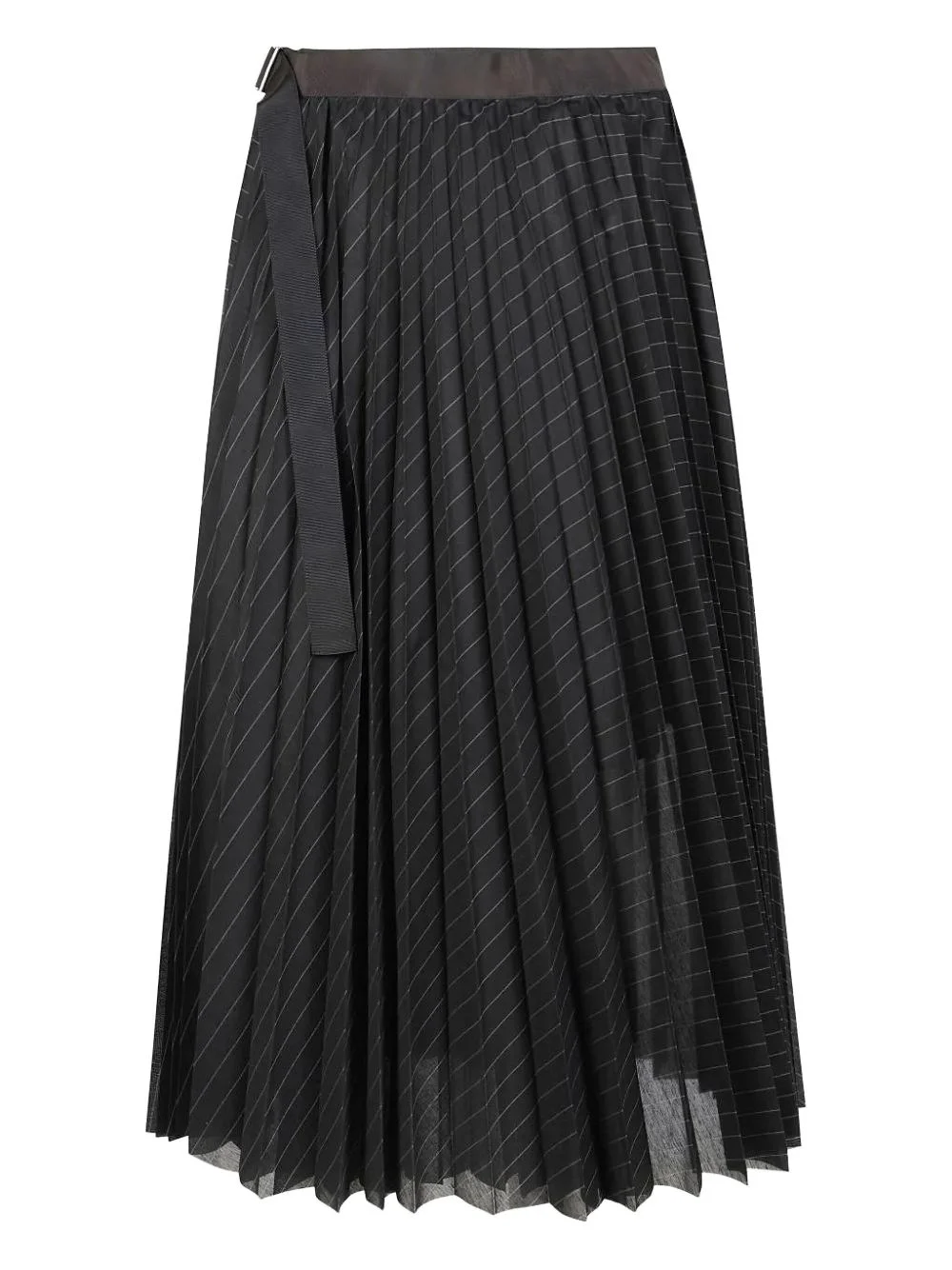 striped pleated skirt Highlights - Black - Striped pattern - Pleated - Belt - Buckle detail Imported Composition Fabric 100% Washing instructions Read Manufacturer Guidelines