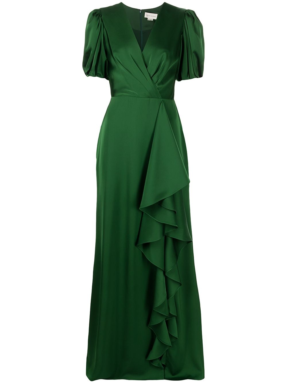 Mila ruffle-drape gown emerald green ruffled detailing plunging V-neck short puff sleeves wrap design concealed rear zip fastening draped design floor-length Imported Composition Body: Polyester 100% SIZE & FIT Model measurements Height 5 ft 10 in(1.77 m) Bust/Chest 33.85 in(86 cm) Hips 35.03 in(89 cm) Waist 24.01 in(61 cm) Washing instructions Dry Clean Only