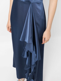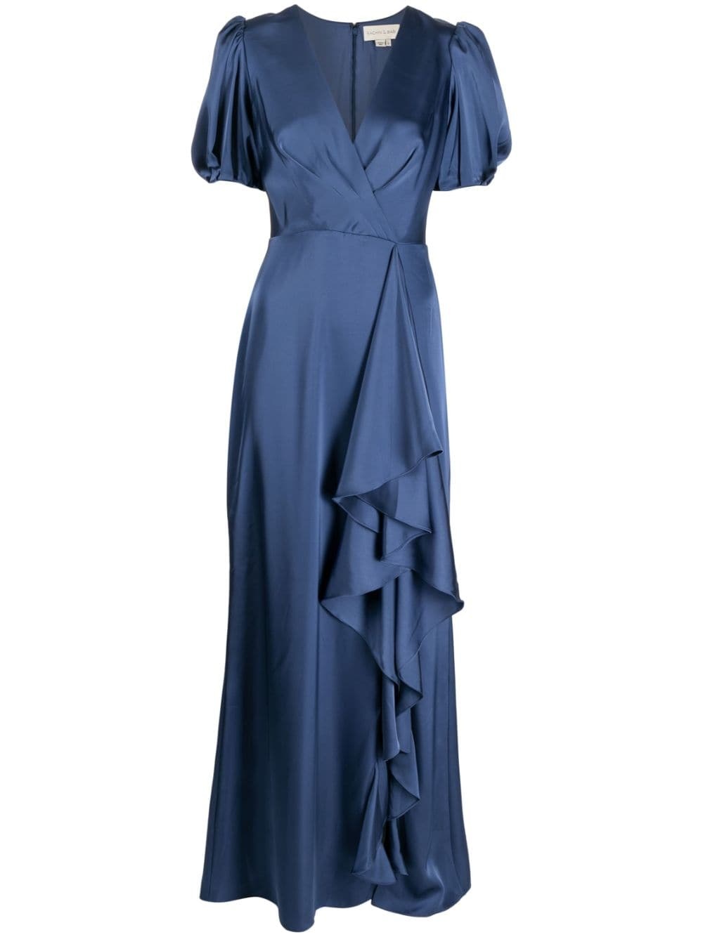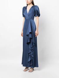 Mila ruffled dress Highlights - Indigo blue - Satin finish - Draped design - Ruffled trim - V-neck - Short puff sleeves - Rear zip fastening - Long length Imported Composition Body: Polyester 100% SIZE & FIT Model measurements Height 5 ft 10 in(1.78 m) Bust/Chest 30.31 in(77 cm) Hips 34.64 in(88 cm) Waist 24.01 in(61 cm) Washing instructions Dry Clean Only