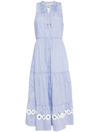 Positano pinstripe-pattern midi dress Highlights - Blue/white - Cotton - Pinstripe pattern - Embroidered detail - Round split neck - Front tie fastening - Concealed front button fastening - Sleeveless - Tiered skirt - Straight hem - Mid-length Imported Composition Cotton 100% SIZE & FIT Model measurements Height 5 ft 10 in(1.78 m) Bust/Chest 32.67 in(83 cm) Hips 37 in(94 cm) Waist 25.59 in(65 cm) FittingInformation Designed for a slim fit that sits just away from the body offering a close yet comfortable fit Made from a midweight non-stretch fabric This piece fits true to size – take your usual size Washing instructions Dry Clean Only