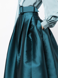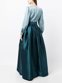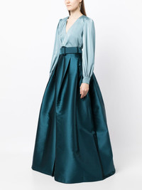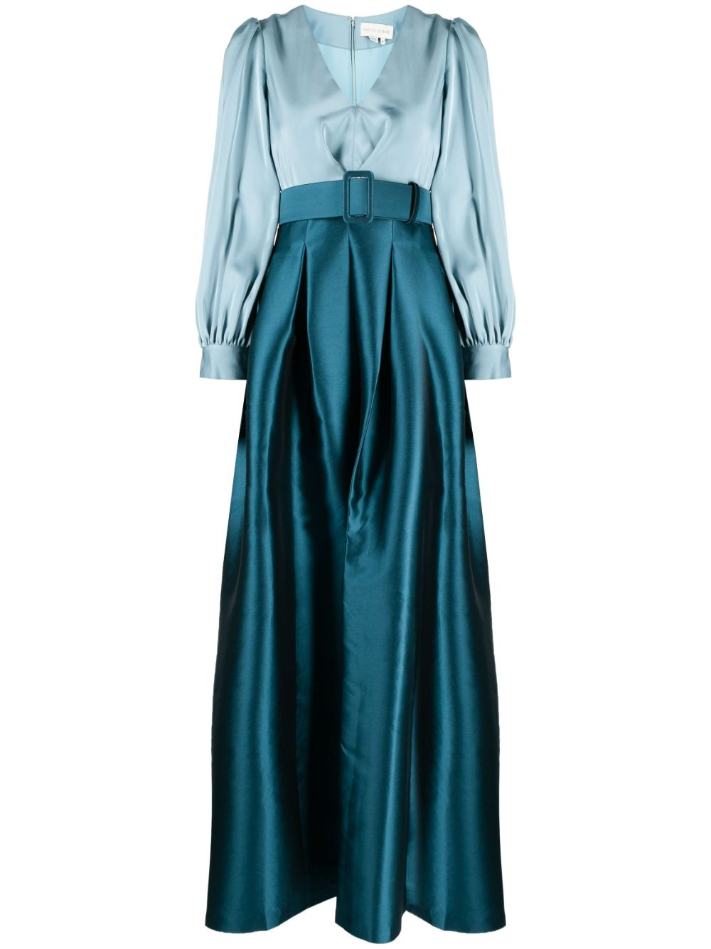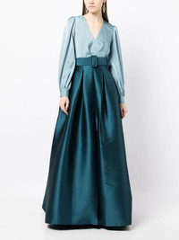 Zoe belted satin gown forest green aqua blue V-neck concealed rear zip fastening long sleeves belted waist front slit two side slit pockets full skirt Imported Composition Body: Polyester 85%, Silk 15% SIZE & FIT Model measurements Height 5 ft 11 in(1.8 m) Bust/Chest 28.34 in(72 cm) Hips 35.43 in(90 cm) Waist 23.62 in(60 cm) FittingInformation This piece fits true to size. We recommend you get your regular size Designed for a close fit at the bust and waist, but loose at the hip Made with a mid-weight non-stretch fabric Washing instructions Dry Clean Only