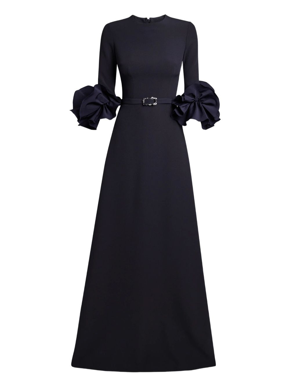 embellished ruffle-sleeve gown Highlights - Blue - Jewel-embellished belt - Ruffle sleeves - A-line shape - Three-quarter sleeves - Round neck Imported Composition Polyester 92%, Elastane 8% Washing instructions Read Manufacturer Guidelines