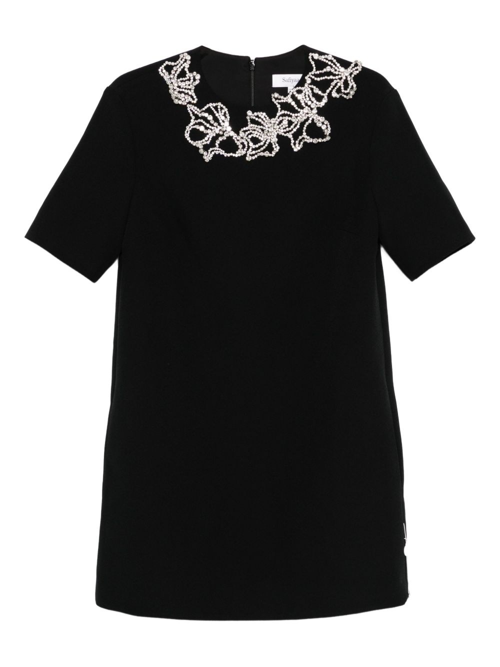 embellished short-sleeved mini day dress Highlights - Black - Embellishment neck - Short sleeves - A-line shape - Straight hem - Round neck Imported Composition Outer: Polyester 92%, Elastane 8% Lining: Polyester 97%, Lycra 3% SIZE & FIT Model measurements Height 5 ft 10 in(1.78 m) Bust/Chest 33.85 in(86 cm) Hips 36.61 in(93 cm) Waist 26.77 in(68 cm) Washing instructions Do Not Wash/Do Not Dry Clean