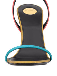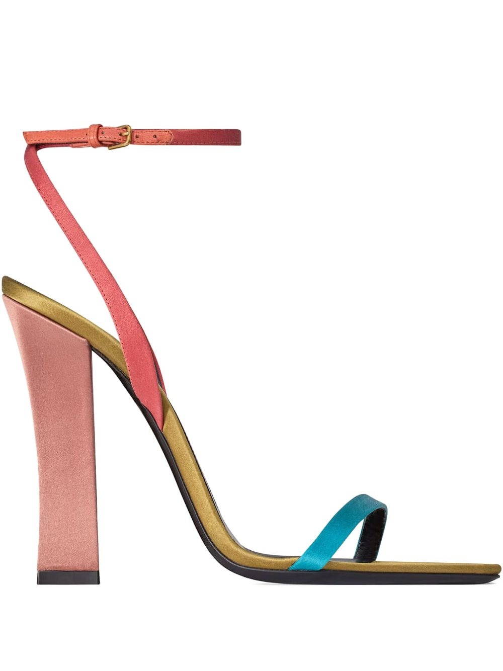 110mm Dominique strappy sandals Highlights - Aqua blue and coral pink - Yellow trim accents - Tapered block heel - Buckle-fastening ankle strap - Open toe Made in Italy Composition Lining: Leather 100% Outer: Viscose 100%, Silk 100% Sole: Leather 100% SIZE & FIT Measurement HEEL 4.33 in(11 cm)