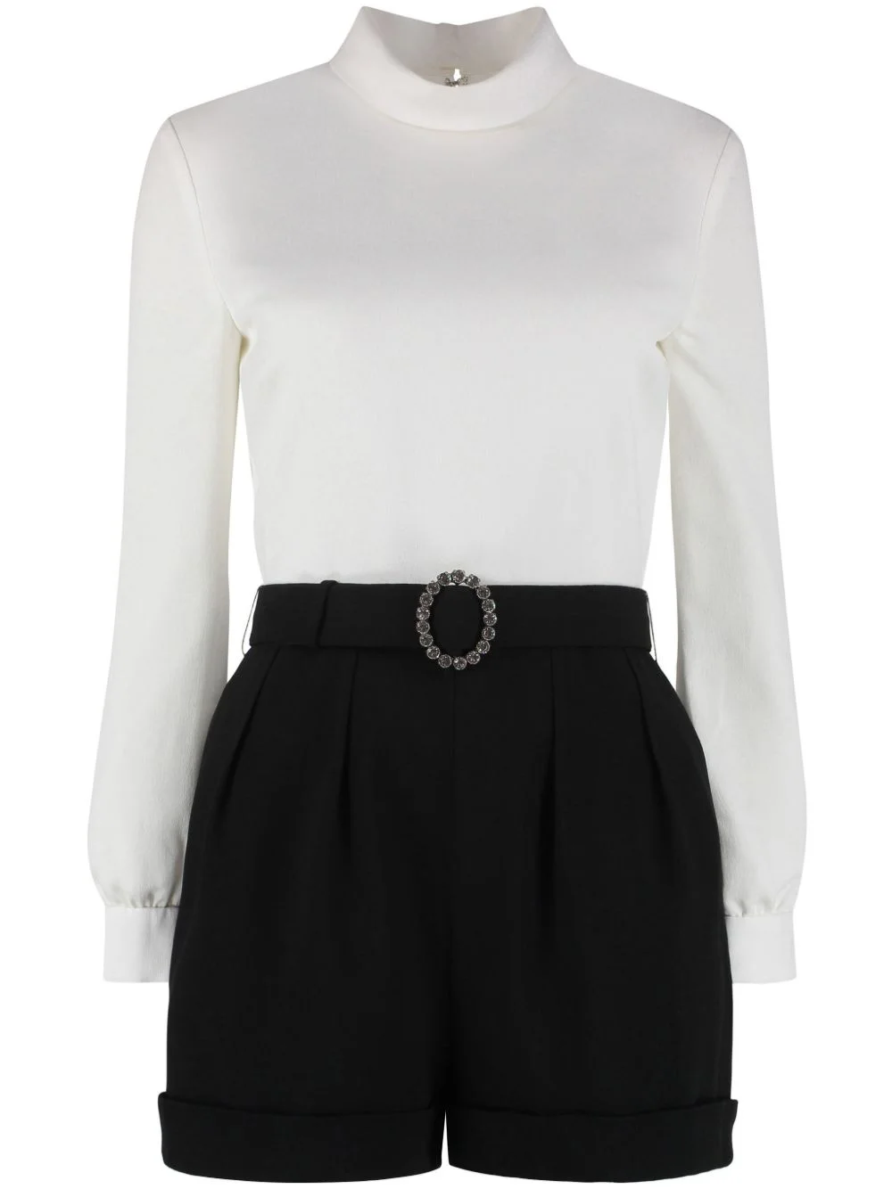 backless playsuit Sleek and sophisticated, this Saint Laurent's playsuit stands out thanks to its backless design. The two-toned piece is crafted from silk and features a belted waist and a high neck. Made in Italy Composition Lining: Silk 100% Outer: Acetate 53%, Viscose 47% SIZE & FIT FittingInformation This piece fits true to size. We recommend you get your regular size Designed for a close fit at the bust, waist and hips Made with a mid-weight non-stretch fabric Washing instructions Dry Clean Only