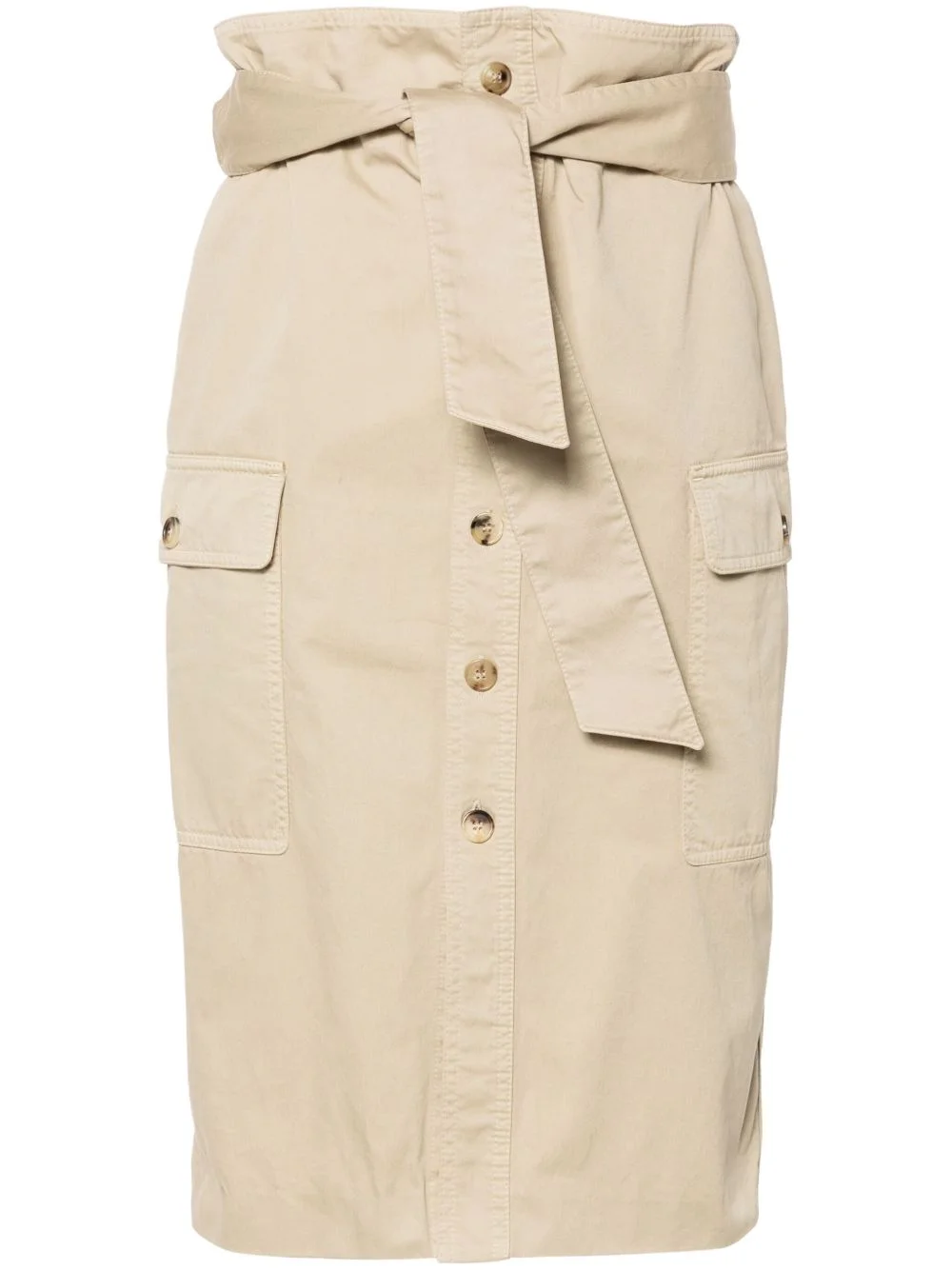 Saharienne midi skirt Highlights - Taupe beige - Cotton - Twill weave - High-waisted - Belted waist - Two side inset pockets - Two side cargo pockets - Knee-length - Straight hem - Front button fastening Made in Italy Composition Cotton 100%, Calf Leather 100% SIZE & FIT Measurement HIPS 37.79 in(96 cm) LENGTH 27.55 in(70 cm) WAIST 25.98 in(66 cm) Washing instructions Machine Wash