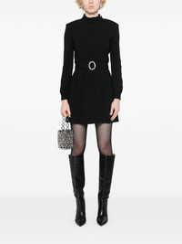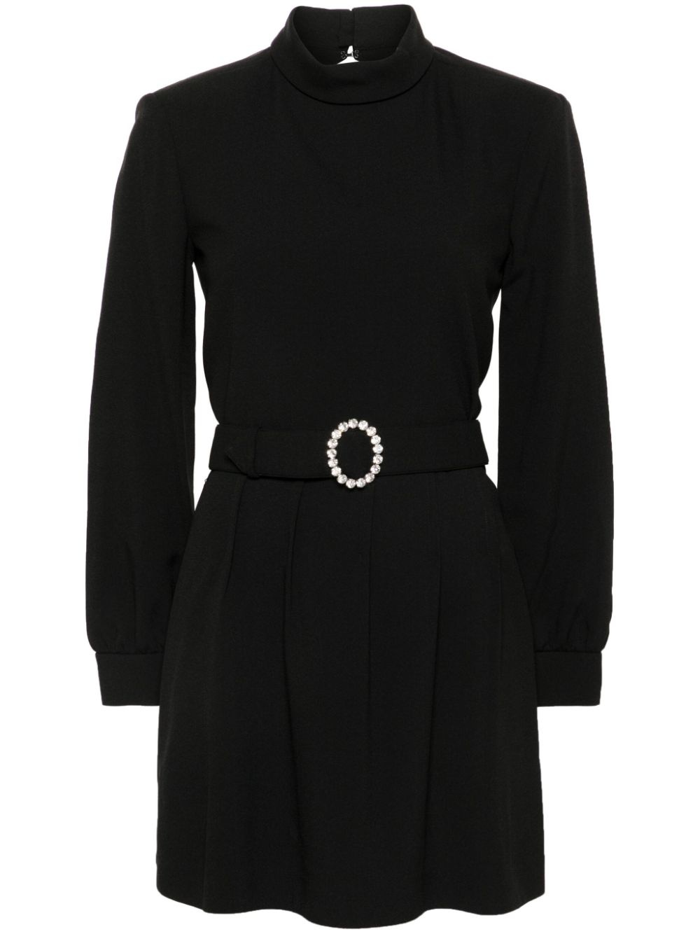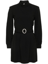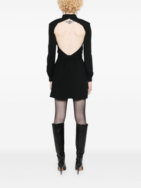 silk mini dress This black short dress shows Saint Laurent's sophisticated yet bold aesthethic. The piece is crafted from silk and stands out thanks to its open back and for its sleek silhouette - thanks to the embellished belt at the waist. Highlights - Black - Silk - Crepe texture - Crystal buckle detail - Roll neck - Rear hook and eye fastening - Open back - Concealed rear hook and zip fastening - Detachable waist belt - Fitted waistline - Pleated skirt - Full lining - Straight hem - Thigh-length Made in Italy Composition Lining: Silk 100% Outer: Acetate 53%, Viscose 47% SIZE & FIT Model measurements Height 5 ft 9 in(1.74 m) Bust/Chest 34.64 in(88 cm) Hips 36.61 in(93 cm) Waist 26.37 in(67 cm) FittingInformation Designed for a slim fit that sits just away from the body offering a close yet comfortable fit The internal shoulder pads offer a structured shape Made from a midweight non-stretch fabric This piece fits true to size – take your usual size Washing instructions Dry Clean Only