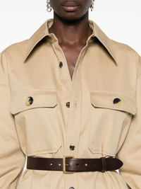 belted Saharienne shirt Highlights - Beige - Cotton - Poplin texture - Classic collar - Long sleeves with buttoned cuffs - Two button-fastening chest pockets - Detachable waist leather belt - Rear box-pleat detail - Straight hem - Front button fastening Made in Italy Composition Cotton 100%, Calf Leather 100% SIZE & FIT Model measurements Height 5 ft 10 in(1.77 m) Bust/Chest 32.28 in(82 cm) Hips 35.03 in(89 cm) Waist 25.19 in(64 cm) FittingInformation Designed to be unstructured, offering a loose fit throughout The belt offers adjustability for fitted preferences Made from a midweight non-stretch fabric This piece fits true to size – take your usual size