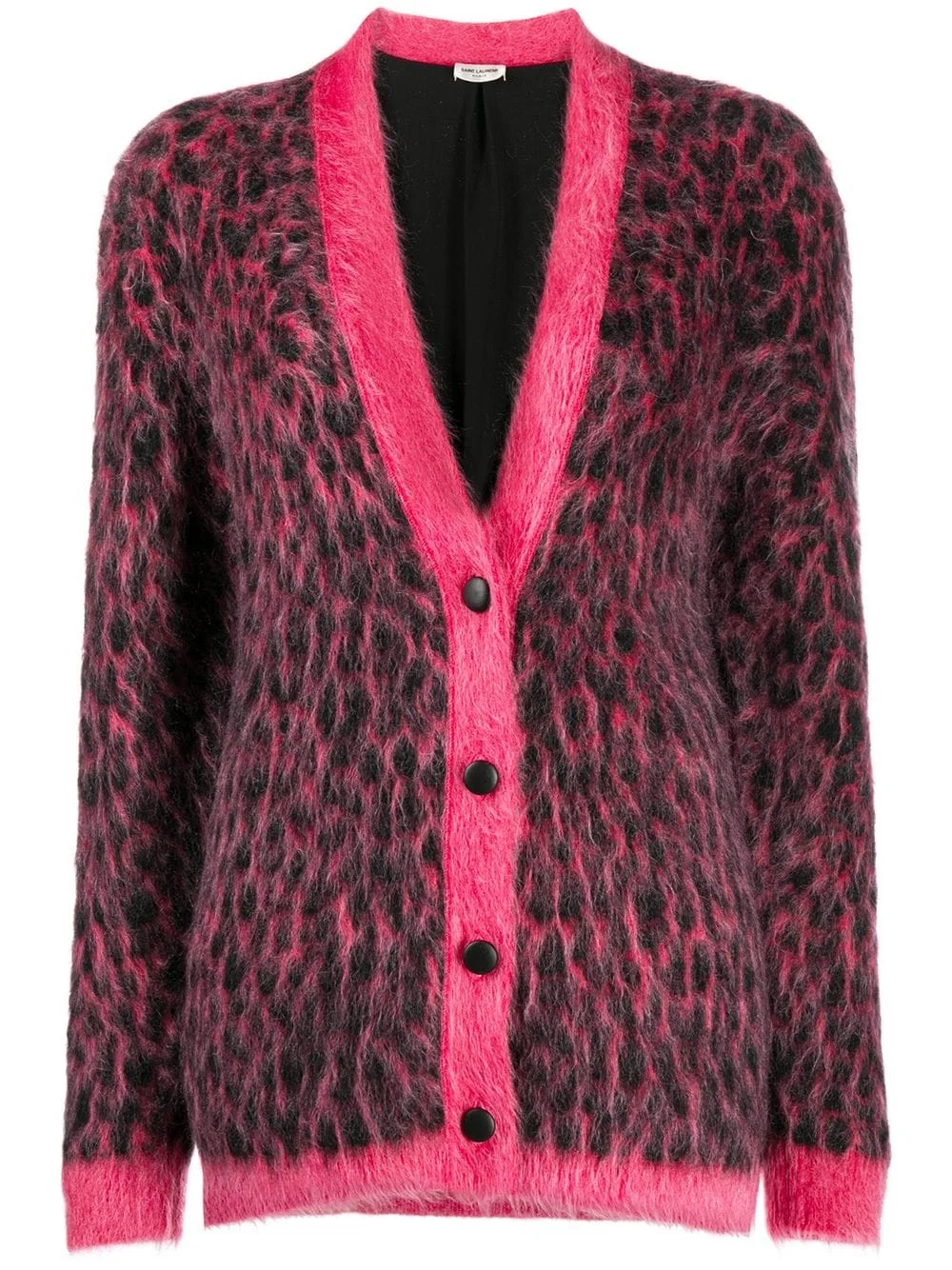 brushed leopard-print wool cardigan Can mohair soothe the soul? We get a calm feeling just looking at this Saint Laurent jumper, even if it is an out-there leopard-print design. But inner peace is hard to come by, so we'd recommend letting this brushed mohair-blend piece into your home. Highlights - Pink/black - Wool mohair-blend/silk - V-neck - Front button fastening - Long sleeves - Silk lining - Two front welt pockets Made in Italy Composition Lining: Silk 100% Outer: Wool 65%, Mohair 21%, Polyamide 13%, Spandex/Elastane 1% SIZE & FIT Model measurements Height 5 ft 11 in(1.8 m) Bust/Chest 33.07 in(84 cm) Hips 37.4 in(95 cm) Waist 25.19 in(64 cm) Measurement SLEEVE LENGTH 25.19 in(64 cm) Shoulder Width 20.07 in(51 cm) LENGTH 27.95 in(71 cm) BUST 38.58 in(98 cm) FittingInformation This piece fits true to size. We recommend you get your regular size Cut for a loose fit Made with a mid-weight fabric Washing instructions Dry Clean Only