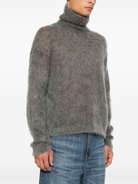 brushed sweater Highlights - Anthracite grey - Mohair blend - Ribbed knit - Brushed effect - Roll neck - Drop shoulder - Long sleeves - Straight hem Made in Italy Composition Mohair 66%, Polyamide 30%, Wool 4% SIZE & FIT Model measurements Height 6 ft 1 in(1.85 m) Bust/Chest 35.82 in(91 cm) Hips 37.79 in(96 cm) Waist 29.13 in(74 cm) Measurement CHEST 47.24 in(120 cm) SLEEVE LENGTH 35.82 in(91 cm) Shoulder Width 24.4 in(62 cm) FittingInformation Designed for a relaxed fit, this piece allows for comfort and movement when worn Made with a midweight knit, this piece offers some stretch