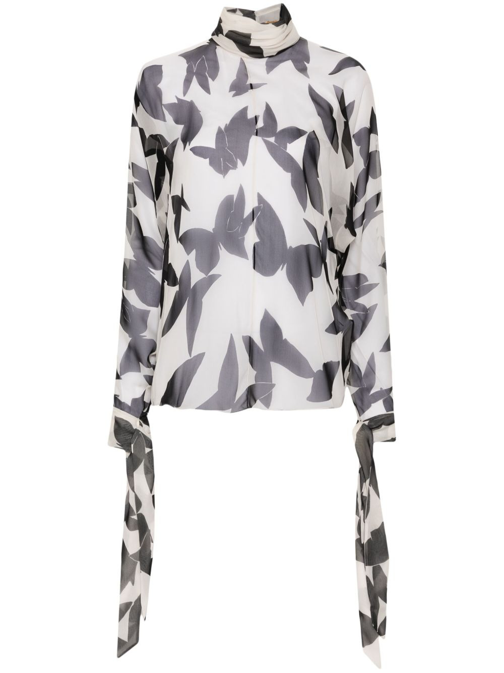 butterfly-print silk blouse Highlights - Light beige/black - Silk - Semi-sheer construction - Butterfly print - High neck - Long sleeves - Tied cuffs - Drop shoulder - Straight hem - Rear teardrop fastening Made in Italy Composition Silk 100% SIZE & FIT Model measurements Height 5 ft 9 in(1.76 m) Bust/Chest 31.88 in(81 cm) Hips 35.43 in(90 cm) Waist 24.8 in(63 cm) Measurement LENGTH 25.59 in(65 cm) FittingInformation Designed to be unstructured, offering a loose fit throughout Made from a lightweight non-stretch fabric This piece fits true to size – take your usual size Washing instructions Dry Clean Only