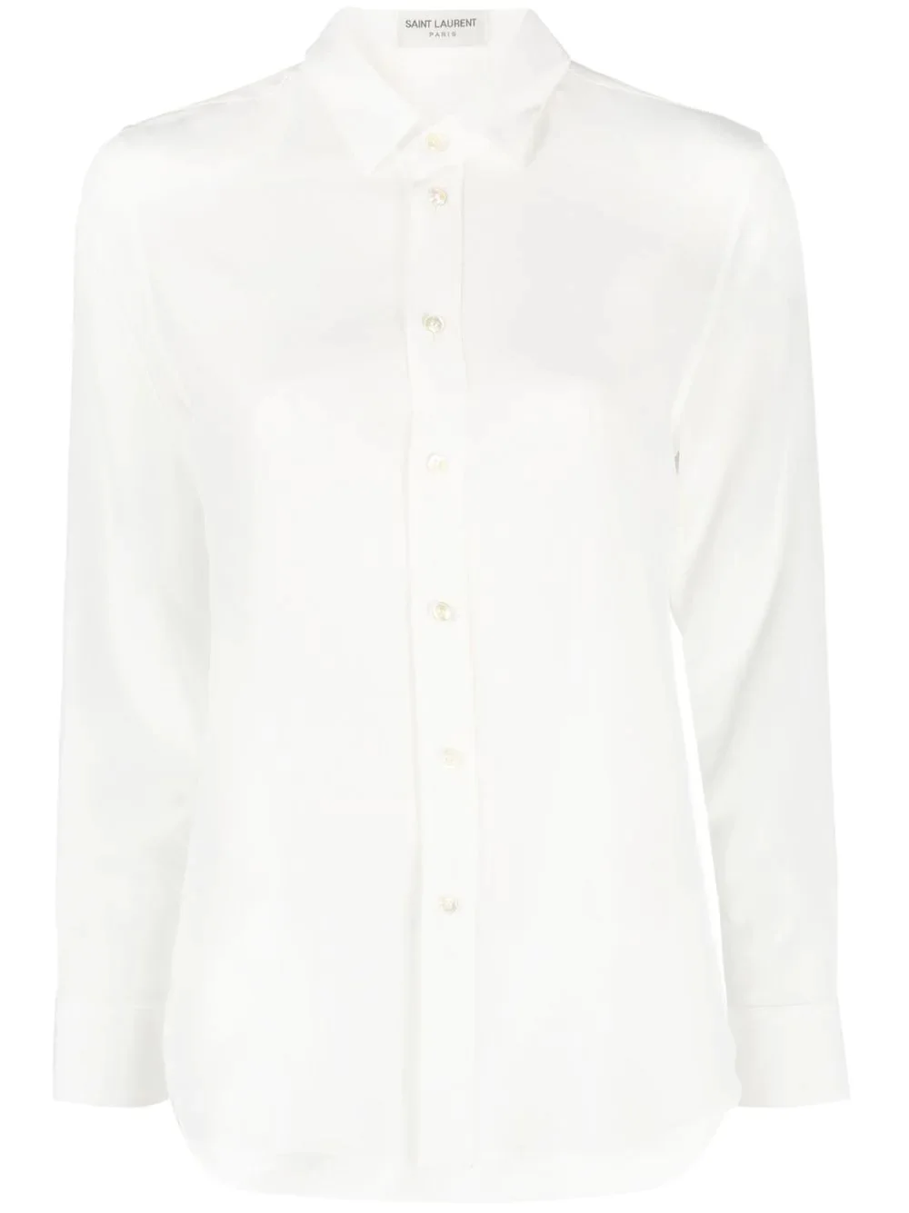 classic collar silk shirt Saint Laurent elevates a classic wardrobe staple with a soft silk crepe construction. A minimal design allows this material to stand out. Highlights - White - Silk - Crepe texture - Spread collar - Front button fastening - Long sleeves - Buttoned cuffs - Curved hem Made in Italy Composition Silk 100%