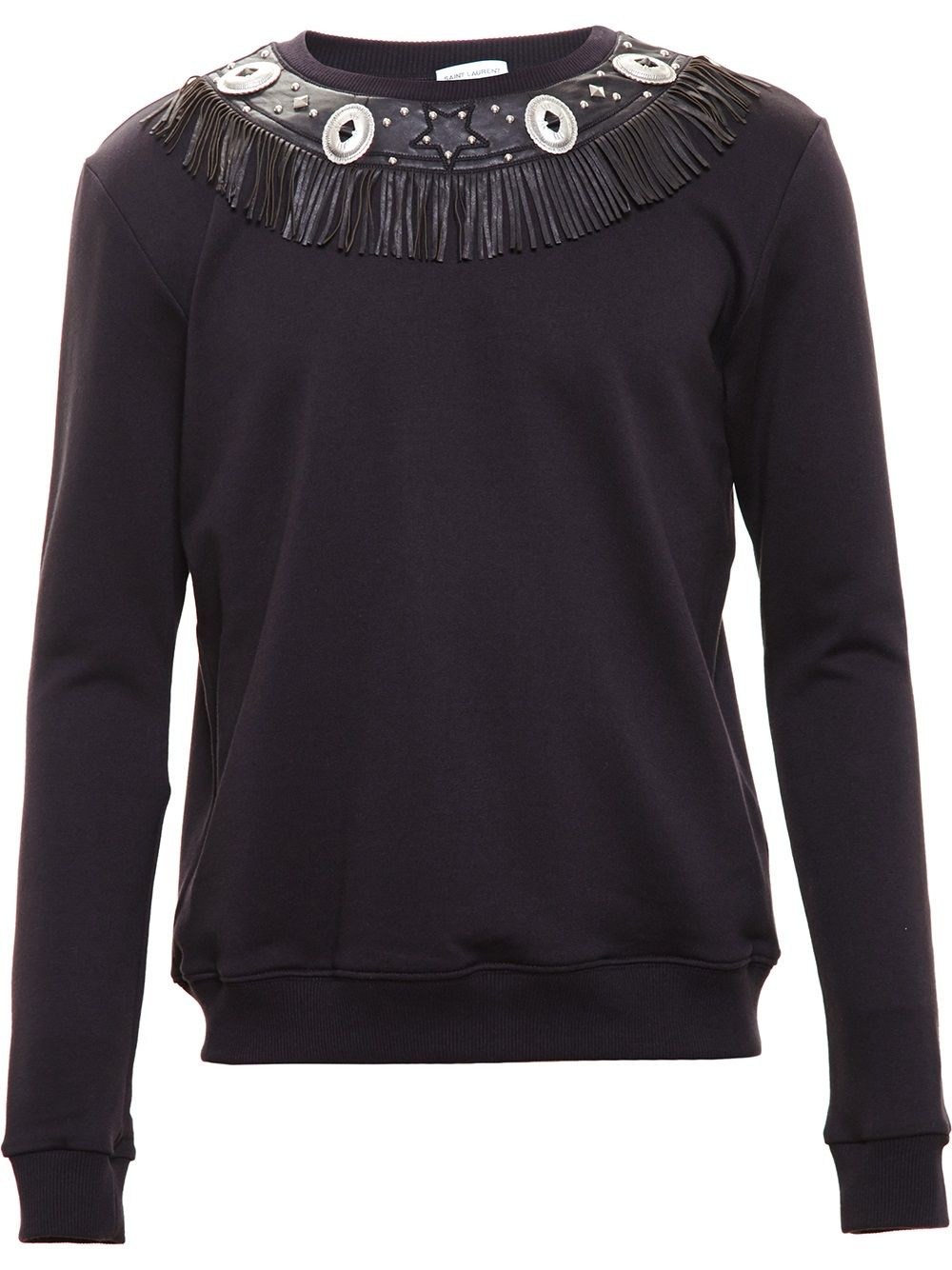 concho detail sweatshirt From the Saint Laurent 'Psych Rock' collection, this leather and jersey sweatshirt exemplifies the 70s' rocker aesthetic that's at the heart of the brand. Imported Composition Cotton 95%, Leather 5%