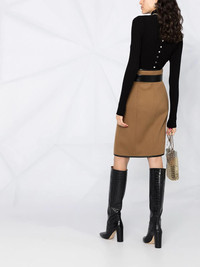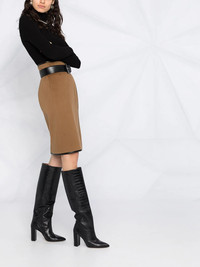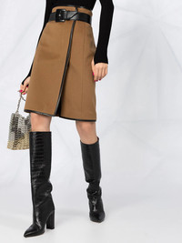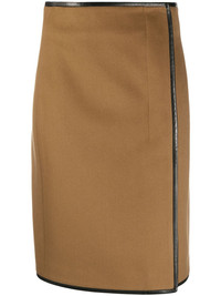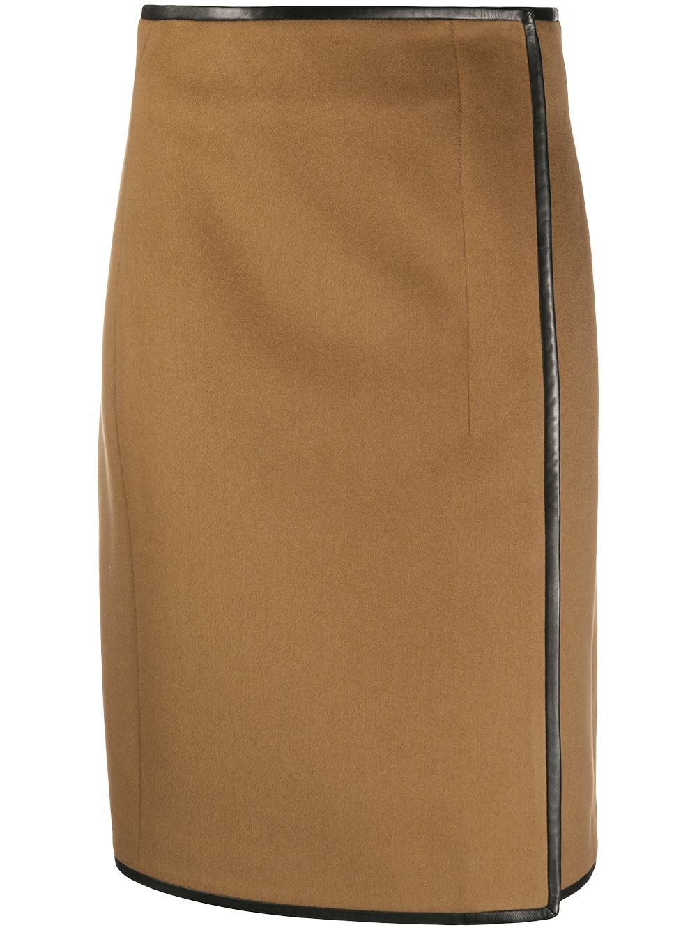 contrast trim midi skirt Let's not 'skirt' around the issue. You adore this contrast trim midi skirt from Saint Laurent. So do we. Made in Italy Composition Outer: Lamb Skin 100%, Wool 90%, Cashmere 10% Lining: Silk 100% SIZE & FIT Model measurements Height 5 ft 10 in(1.79 m) Bust/Chest 33.07 in(84 cm) Hips 35.82 in(91 cm) Waist 24.01 in(61 cm) Washing instructions Specialist Cleaning