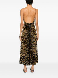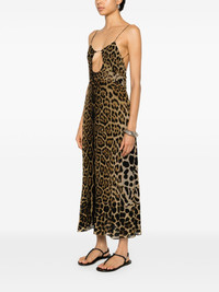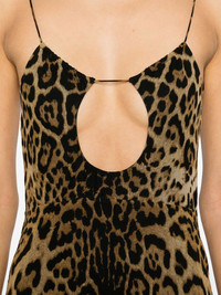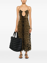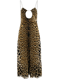 leopard-print midi dress Saint Laurent's dress is an ode to the striking leopard print. Bold leopard spots decorate the entirety of the flared silhouette with a circular cut-out at the chest revealing a glimpse of skin. Highlights - Black/brown - Wool - All-over leopard print - Cut-out detailing - Scoop neck - Spaghetti straps - Low back - Flared hem - Silk lining - Concealed rear zip fastening Made in France Composition Lining: Silk 100% Outer: Wool 100% SIZE & FIT Model measurements Height 5 ft 9 in(1.76 m) Bust/Chest 31.88 in(81 cm) Hips 35.43 in(90 cm) Waist 24.8 in(63 cm) FittingInformation Designed for a slim fit that sits just away from the body offering a close yet comfortable fit Made from a midweight non-stretch fabric This piece fits true to size – take your usual size