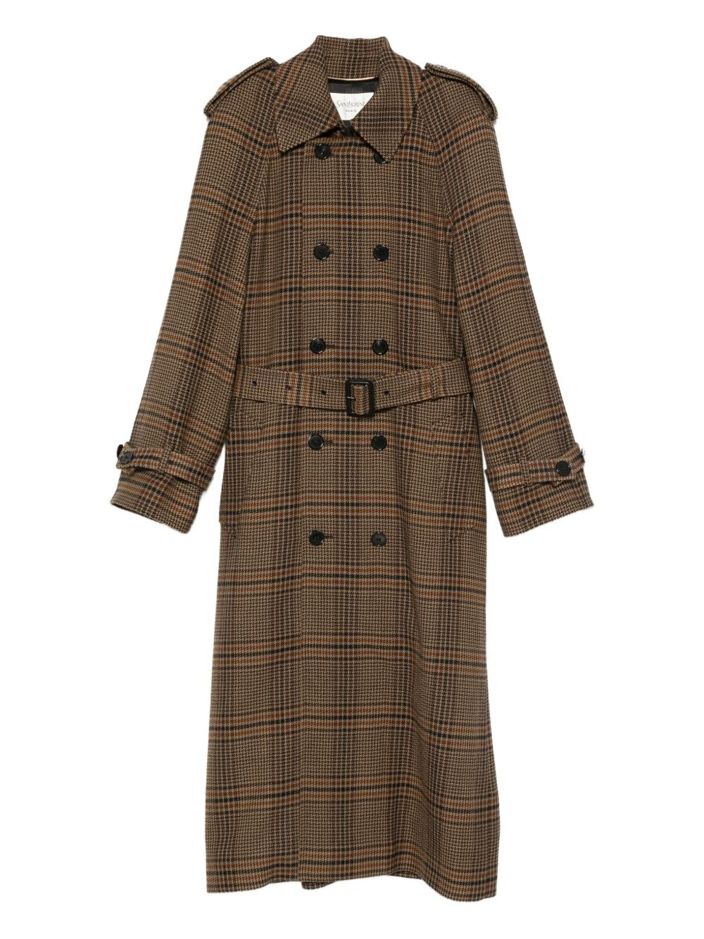 double-breasted checked trench coat Highlights - Brown - Checked pattern - Double-breasted closure - Belted waist - Long sleeves Made in Italy Composition Outer: Wool 100% Lining: Viscose 64%, Cotton 36% SIZE & FIT Model measurements Height 5 ft 10 in(1.77 m) Bust/Chest 32.28 in(82 cm) Hips 35.03 in(89 cm) Waist 25.19 in(64 cm) Washing instructions Dry Clean Only