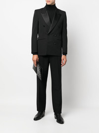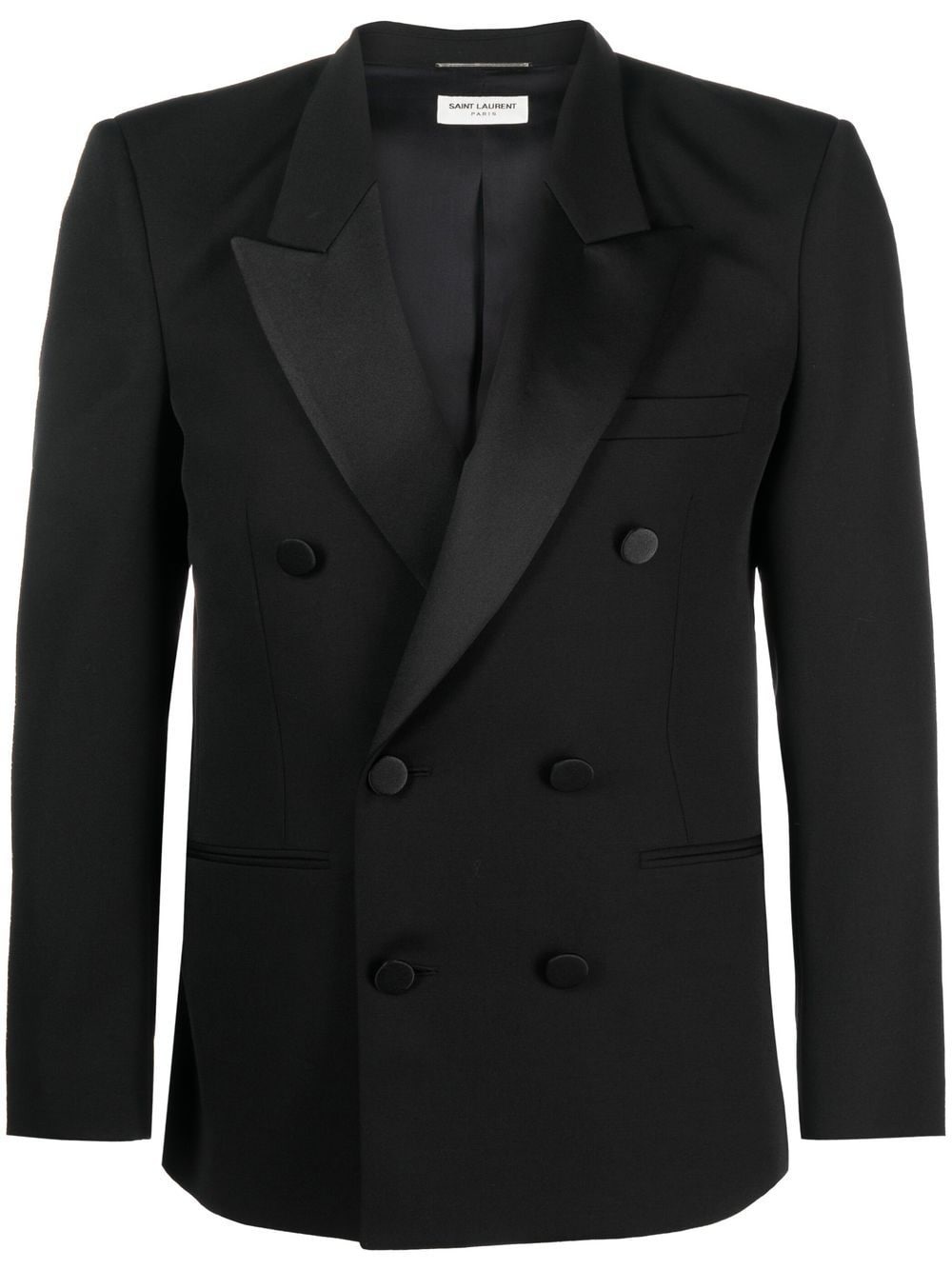 double-breasted tailored blazer jet black wool-silk blend double-breasted button fastening classic lapels long sleeves two side welt pockets tailored cut Made in Italy Composition Lining: Spandex/Elastane 3% Outer: Wool 100% SIZE & FIT Model measurements Height 6 ft 1 in(1.86 m) Bust/Chest 37.4 in(95 cm) Hips 34.64 in(88 cm) Waist 29.13 in(74 cm) FittingInformation This piece fits small – you might want to get one size up Cut for a slim fit Made with a mid-weight fabric