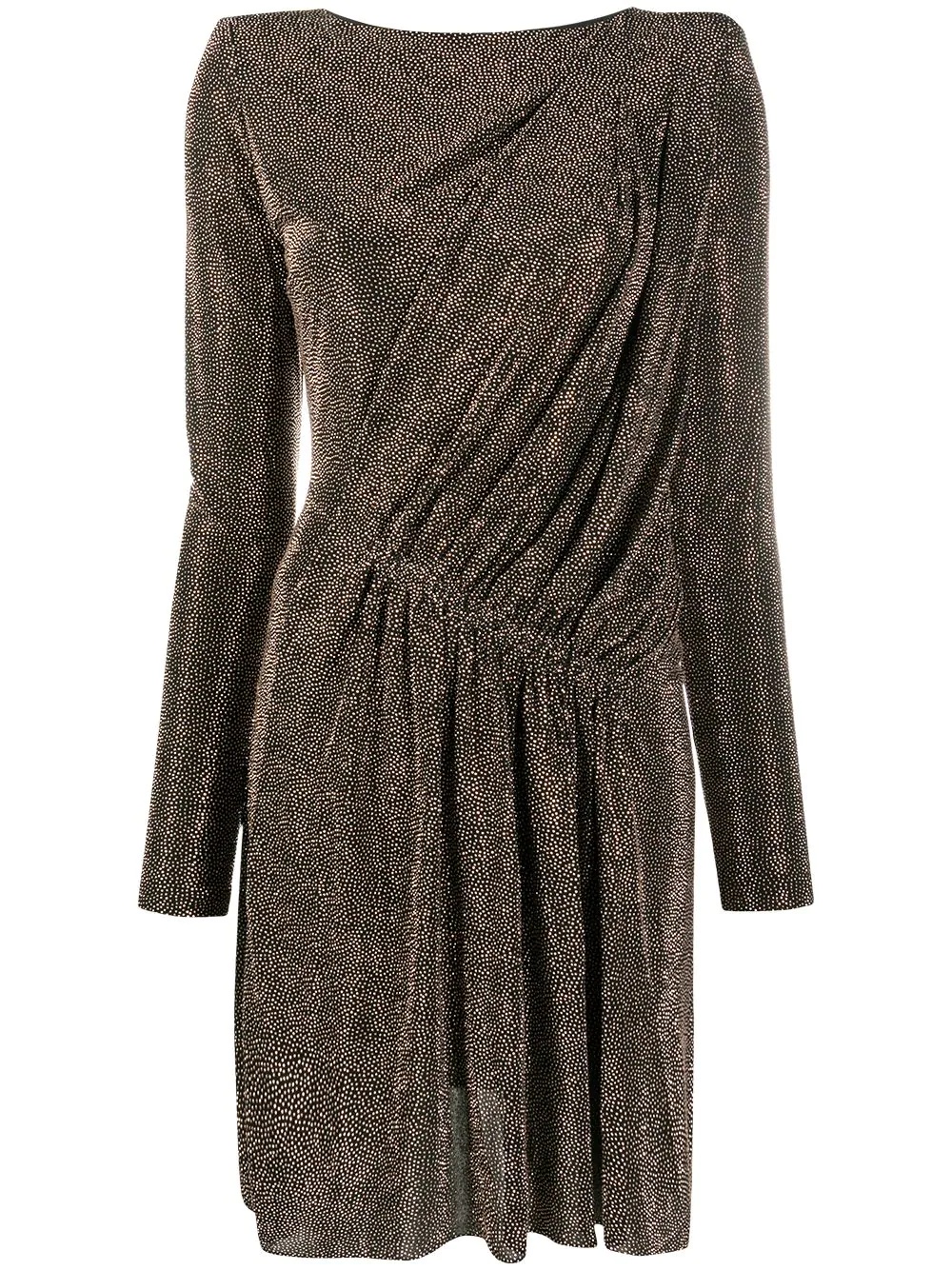 draped metallic padded-shoulder dress Steal attention with this draped metallic padded-shoulder dress from Saint Laurent. Designed with gold-tone metallic detailing and a draped design to the front, this standout piece is ideal for dinner, drinks and dancing. It's the triple threat! Highlights - Black - Gold-tone metallic effect - Draped detailing - Gathers to the front - Shoulder pads - Long sleeves - Elasticated waistband Made in France Composition Outer: Viscose 100% Lining: Viscose 100% SIZE & FIT Model measurements Height 5 ft 10 in(1.78 m) Bust/Chest 33.07 in(84 cm) Hips 33.07 in(84 cm) Waist 24.4 in(62 cm) FittingInformation This piece fits true to size. We recommend you get your regular size Designed for a close fit at the bust, waist and hips Made with a mid-weight fabric Washing instructions Dry Clean Only
