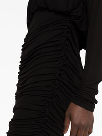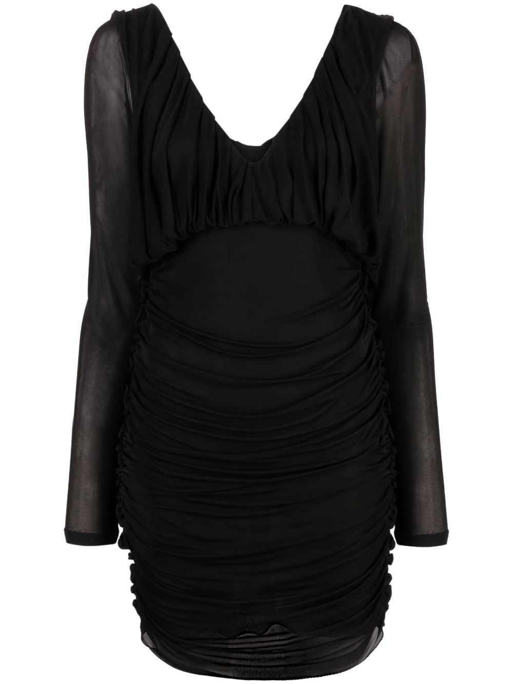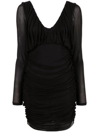 draped V-neck minidress Parisian luxury fashion house Saint Laurent presents its own version of the little black dress with this piece. Draped detailing at the V-neck and skirt adds soft texture and movement, and is offset by the semi-sheer long sleeves. Highlights - Black - Draped design - V-neck - V-back - Long sleeves - Curved hem - Thigh-length Made in Italy Composition Outer: Cupro 100% SIZE & FIT Model measurements Height 5 ft 10 in(1.77 m) Bust/Chest 32.28 in(82 cm) Hips 35.03 in(89 cm) Waist 25.19 in(64 cm) FittingInformation Designed for a loose fit at the chest with a close fit over the waist and hips Made from a midweight stretch fabric, this piece offers elasticity and flexibility when worn This piece fits true to size – take your usual size Measurement BUST 32 in(81.3 cm) LENGTH 32.99 in(83.8 cm) WAIST 24.01 in(61 cm) SLEEVE LENGTH 27 in(68.6 cm) HIPS 25.98 in(66 cm) Washing instructions Dry Clean Only