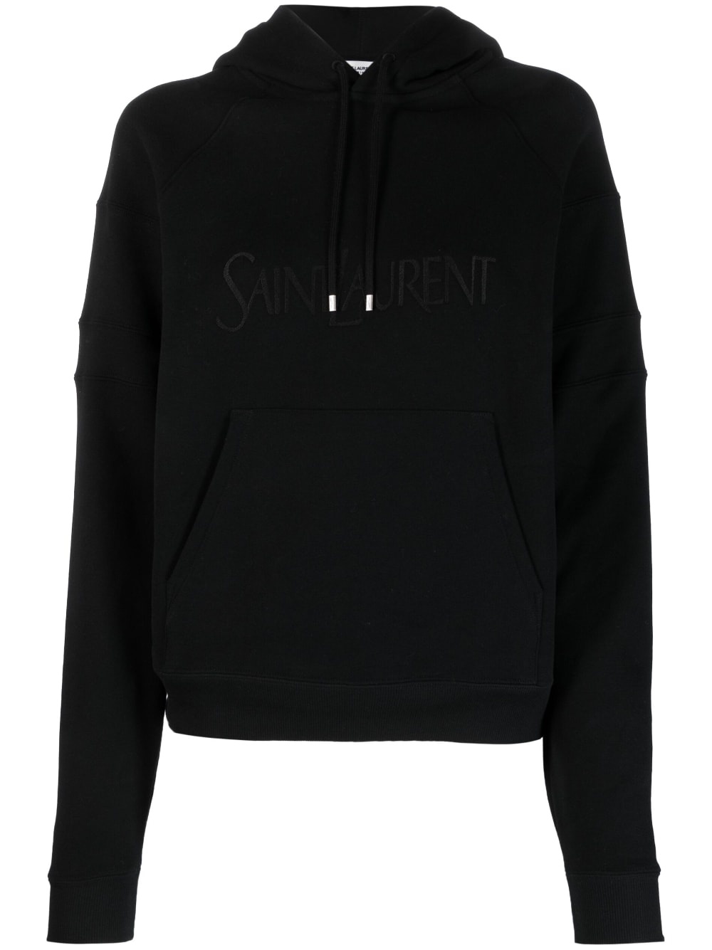 embroidered-logo cotton hoodie Made from pure cotton, this hoodie from Saint Laurent is minimally detailed with an embroidered logo at the front in tonal black threads. Highlights - Black - Cotton - Embroidered logo to the front - Drawstring hood - Long sleeves - Front pouch pocket - Straight hem Made in France Composition Cotton 100%, Polyester 100% SIZE & FIT Model measurements Height 5 ft 9 in(1.75 m) Bust/Chest 31.49 in(80 cm) Hips 34.05 in(86.5 cm) Waist 24.21 in(61.5 cm) FittingInformation Designed to be unstructured, offering a loose fit throughout Made from a midweight non-stretch fabric, this piece offers minimal elasticity when worn This piece fits true to size – take your usual size Washing instructions Dry Clean Only