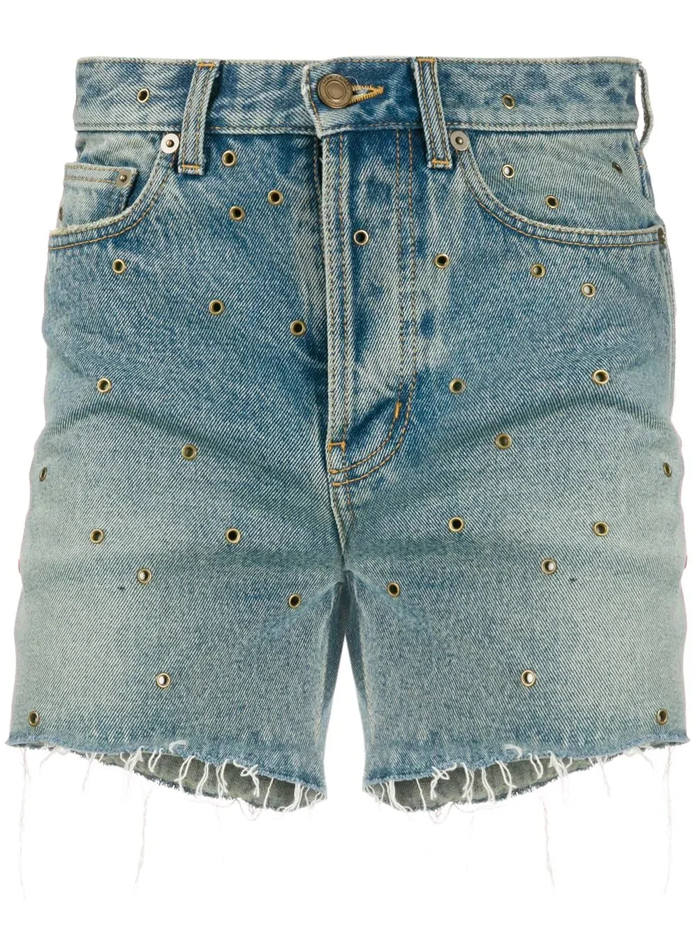 eyelet denim shorts Update your denim with these shorts from Saint Laurent. Crafted in light blue cotton, these frayed hem denim shorts are accented with eyelets. The key is in the detail. Featuring belt loops, a button fastening, a five pocket design and raw edges. Imported Composition Cotton 100% SIZE & FIT Model measurements Height 6 ft 2 in(1.88 m) Bust/Chest 36.61 in(93 cm) Hips 35.82 in(91 cm) Waist 27.95 in(71 cm) FittingInformation This piece fits true to size. We recommend you get your regular size Cut for a slim fit Made with a mid-weight non-stretch fabric Washing instructions Machine Wash