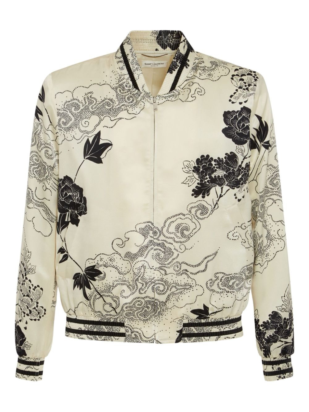 floral-print bomber jacket off white/black silk all-over floral print stripe trim ribbed band collar front zip fastening long sleeves elasticated cuffs two side slit pockets elasticated hem Made in Italy Composition Silk 100% Washing instructions Read Manufacturer Guidelines