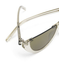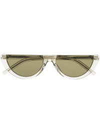 half-moon shaped sunglasses Highlights - Sage green - Transparent frame - Green tinted lenses - Straight arms - Curved tips - These glasses come with a protective case. Made in Italy Composition Acetate 100% SIZE & FIT Measurement Arm Length 5.7 in(14.5 cm) Bridge Width 0.62 in(1.6 cm) Lens Diameter 2.28 in(5.8 cm) Total Width 5.7 in(14.5 cm)