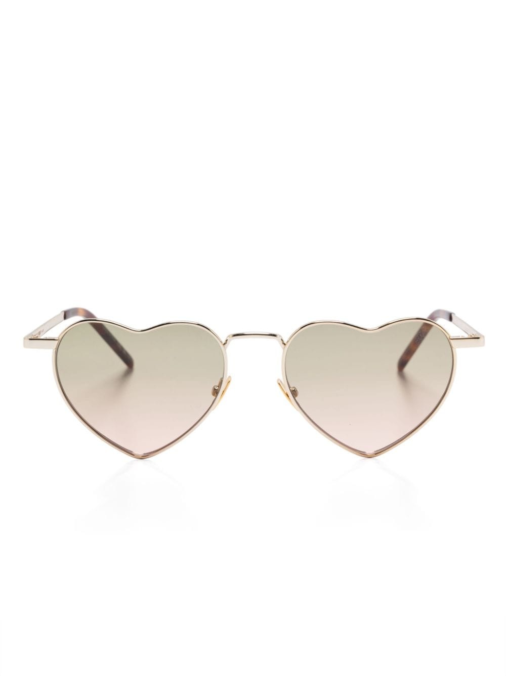 heart-frame sunglasses These LouLou sunglasses from Saint Laurent Eyewear are characterised by distinctive heart-shaped frames. Slim metal frames in gold-tone metal showcase the maison's signature sleek aesthetic. Highlights - Gold-tone - Polished finish - Heart-shape frame - Uv-protective gradient lenses - Logo-engraved arm - Tortoiseshell-effect curved tips - Nose pads - These glasses come with a protective case. Made in Italy Composition Metal 100%, Acrylic 100% SIZE & FIT Measurement Arm Length 5.7 in(14.5 cm) Bridge Width 0.66 in(1.7 cm) Lens Diameter 2.04 in(5.2 cm) Total Width 5.47 in(13.9 cm)