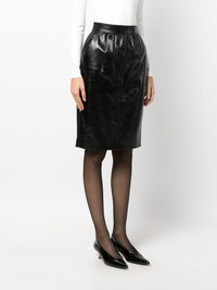 high-waist leather pencil skirt Crafted from glossy black leather, this pencil skirt depicts Saint Laurent’s penchant for craftsmanship and bold silhouettes. It’s designed to sit high on the waist and is enhanced with pleat detailing that creates a voluminous effect. Highlights - Black - Calf leather - Pleat detailing - High-waisted - Concealed side zip fastening - Two side slash pockets - Silk lining - Rear slit - Knee-length Made in Italy Composition Outer: CALFSKIN 100% Lining: Silk 100% SIZE & FIT Model measurements Height 5 ft 10 in(1.77 m) Bust/Chest 31.1 in(79 cm) Hips 35.03 in(89 cm) Waist 23.62 in(60 cm) Measurement HIPS 34.64 in(88 cm) LENGTH 22.83 in(58 cm) WAIST 24.4 in(62 cm)
