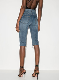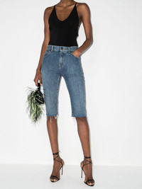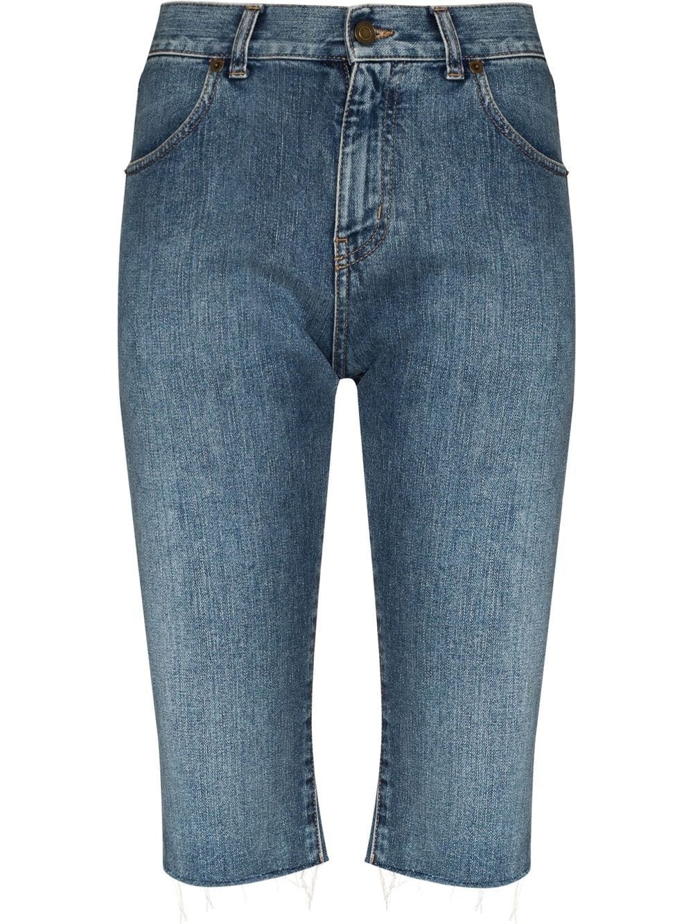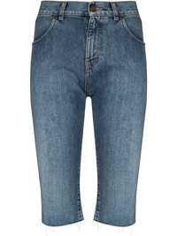 high-waisted denim shorts Saint Laurent's sleek, minimalist style is showcased in this pair of denim shorts from the SS22 collection, which feature a classic blue colourway, distressed-finish detailing and a raw-cut hem. Highlights - Denim blue - Cotton - Denim - Logo patch to the rear - High waist - Belt loops - Front button and zip fastening - Slim cut - Classic five pockets - Raw-cut hem - Knee-length Made in Italy Composition Leather 100%, Cotton 100% SIZE & FIT Model measurements Height 5 ft 11 in(1.81 m) Bust/Chest 31.49 in(80 cm) Hips 35.82 in(91 cm) Waist 22.83 in(58 cm) Washing instructions Machine Wash