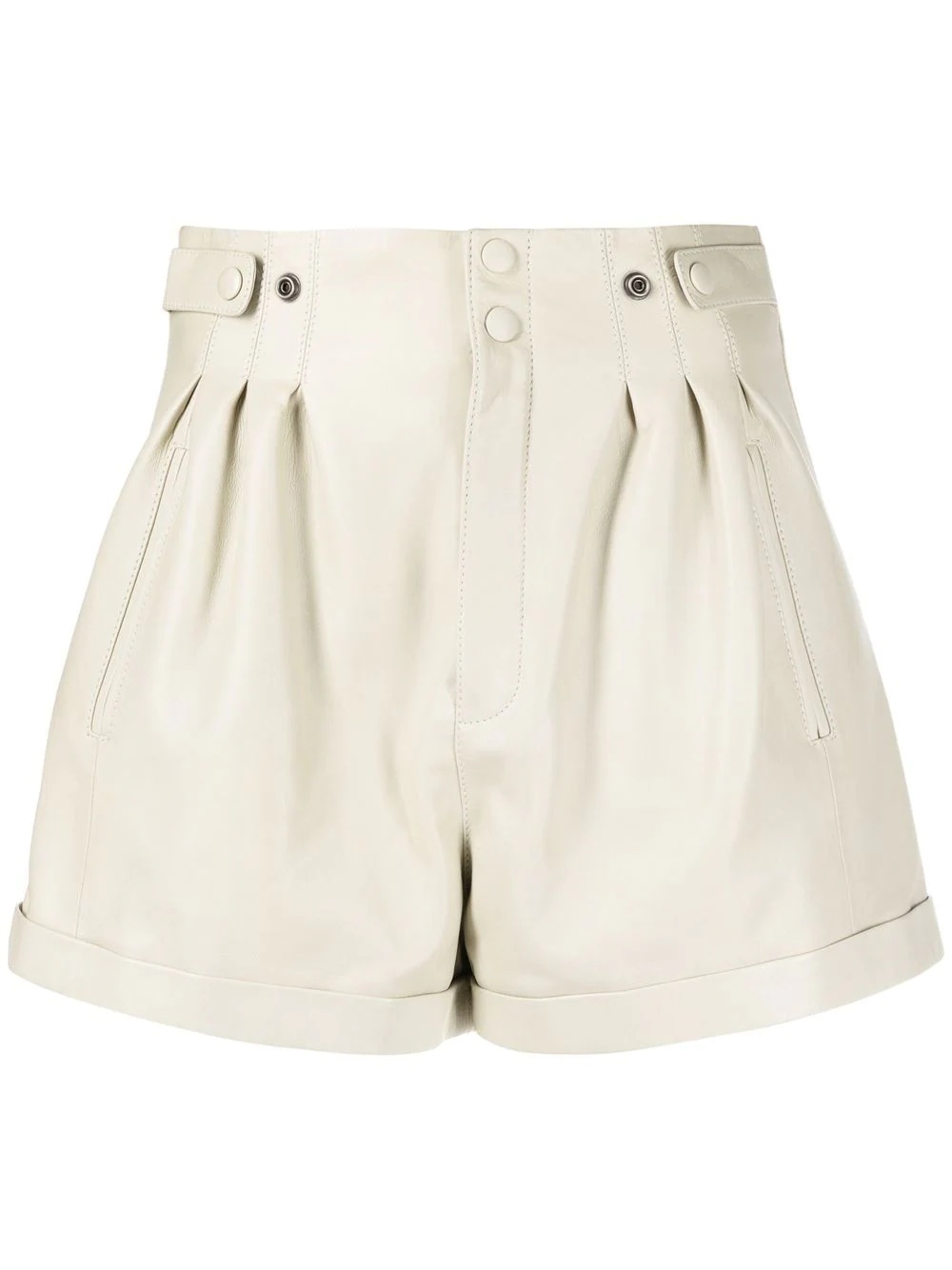 high-waisted leather shorts Crafted from supple lambskin leather, Saint Laurent's high-waisted shorts arrive in a soft beige hue, adding to their sophistication. Made in Italy Composition Lining: Cotton 100%, Cupro 60%, Silk 40% Outer: Lambskin 100% SIZE & FIT Model measurements Height 5 ft 11 in(1.8 m) Bust/Chest 31.49 in(80 cm) Hips 36.61 in(93 cm) Waist 24.4 in(62 cm) FittingInformation This piece fits true to size. We recommend you get your regular size Designed to be fitted at the waist and hips, loose over the leg Made with a mid-weight non-stretch fabric Washing instructions Specialist Cleaning
