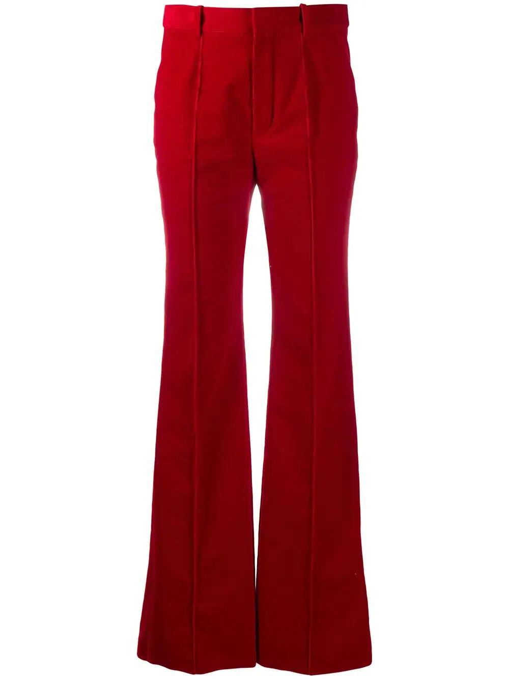 high-waisted straight-leg trousers Blending in? That's not for you and it's not for these bright-red, high-waisted trousers from Saint Laurent. The two of you were clearly meant to be. Highlights - Red - Cotton - High waist - Belt loops - Concealed front fastening - Two rear welt pockets - Exposed-seam detailing - Straight leg Made in Italy Composition Outer: Cotton 100% Lining: Cotton 100% SIZE & FIT Model measurements Height 5 ft 10 in(1.77 m) Bust/Chest 35.03 in(89 cm) Hips 35.03 in(89 cm) Waist 23.62 in(60 cm) Measurement FRONT RISE 11.22 in(28.5 cm) INSIDE LEG 35.82 in(91 cm) BACK RISE 15.55 in(39.5 cm) HIPS 40.15 in(102 cm) FittingInformation This piece fits true to size. We recommend you get your regular size Designed to be fitted at the waist and through the thigh, loose from the knee Made with a mid-weight non-stretch fabric Washing instructions Dry Clean Only