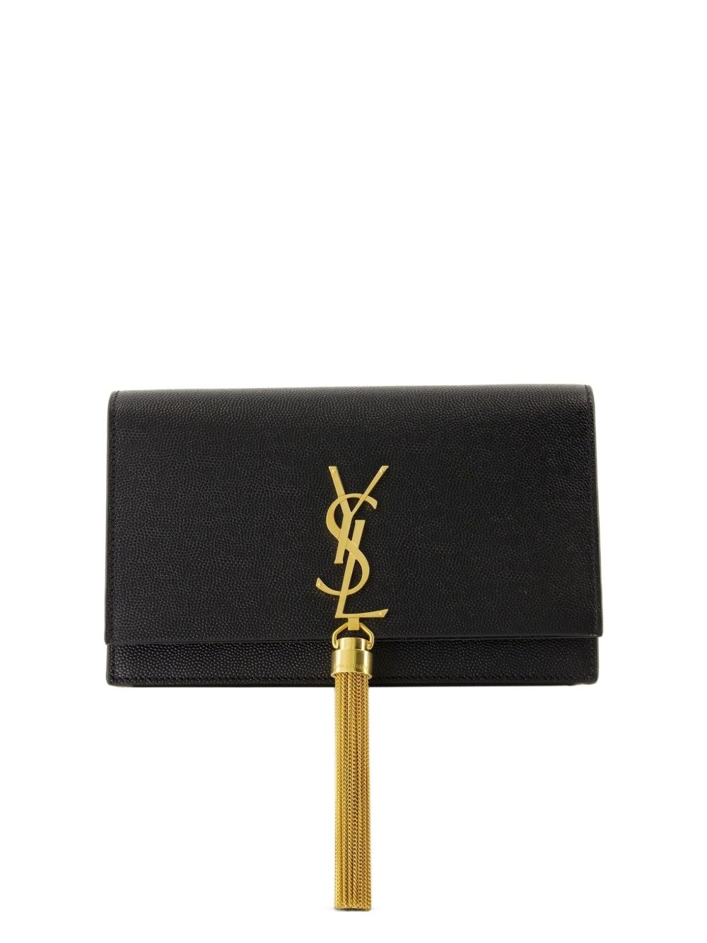 Kate tassel-embellished crossbody bag A signature of Saint Laurent, the Kate crossbody bag is crafted from grained leather in a versatile black hue. This compact accessory is embellished with the iconic 'YSL' logo plaque on the front, complete with a suspended chain tassel in polished gold-tone metal for a refined look. Highlights - Black - Leather - Grained texture - Gold-tone logo plaque - Gold-tone hardware - Tassel detail - Chain-link shoulder strap - Foldover top - Concealed magnetic fastening - Internal slip pocket - This piece comes complete with a protective dust bag. Made in Italy Composition Outer: Calf Leather 100% SIZE & FIT Measurement WIDTH 7.48 in(19 cm) HEIGHT 4.92 in(12.5 cm) DEPTH 1.57 in(4 cm) STRAP 23.62 in(60 cm)