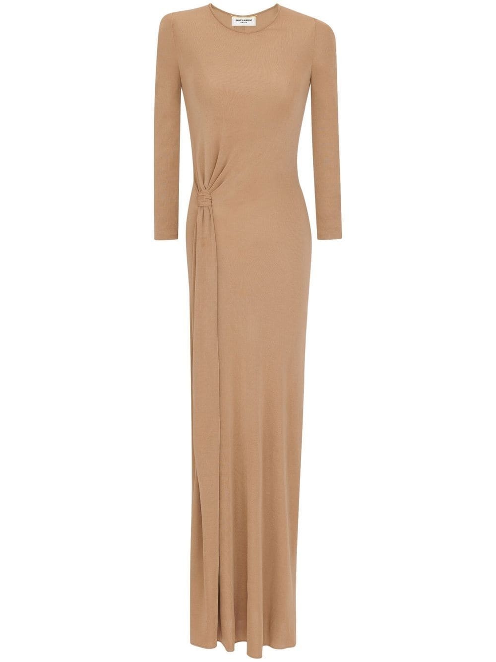 knot-detail maxi dres True to Saint Laurent's minimalist style, this floor-length dress is realised in a beige hue and subtly decorated with an intriguing knot-detail to the side. Highlights - Beige - Knot detailing - Round neck - Long sleeves - Floor-length Made in Italy Composition Viscose 100% SIZE & FIT Measurement HIPS 33.07 in(84 cm) LENGTH 62.2 in(158 cm) WAIST 26.77 in(68 cm) Washing instructions Read Manufacturer Guidelines