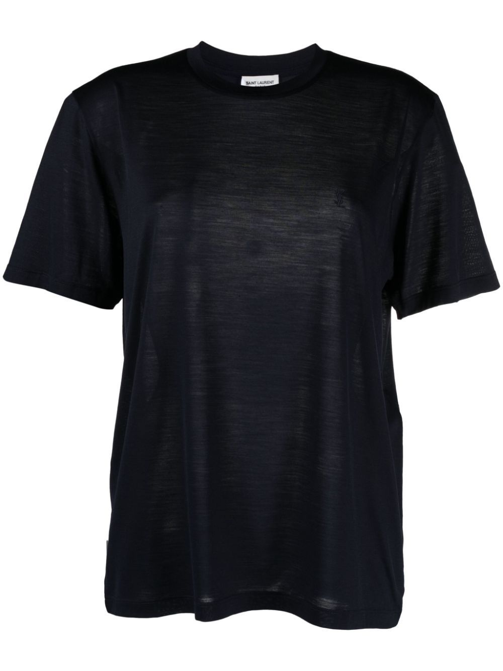 logo-embroidered wool-silk blend T-shirt Highlights - Navy blue - Wool-silk blend - Embroidered logo at the chest - Round neck - Short sleeves - Straight hem Made in Italy Composition Wool 70%, Silk 30% Washing instructions Read Manufacturer Guidelines