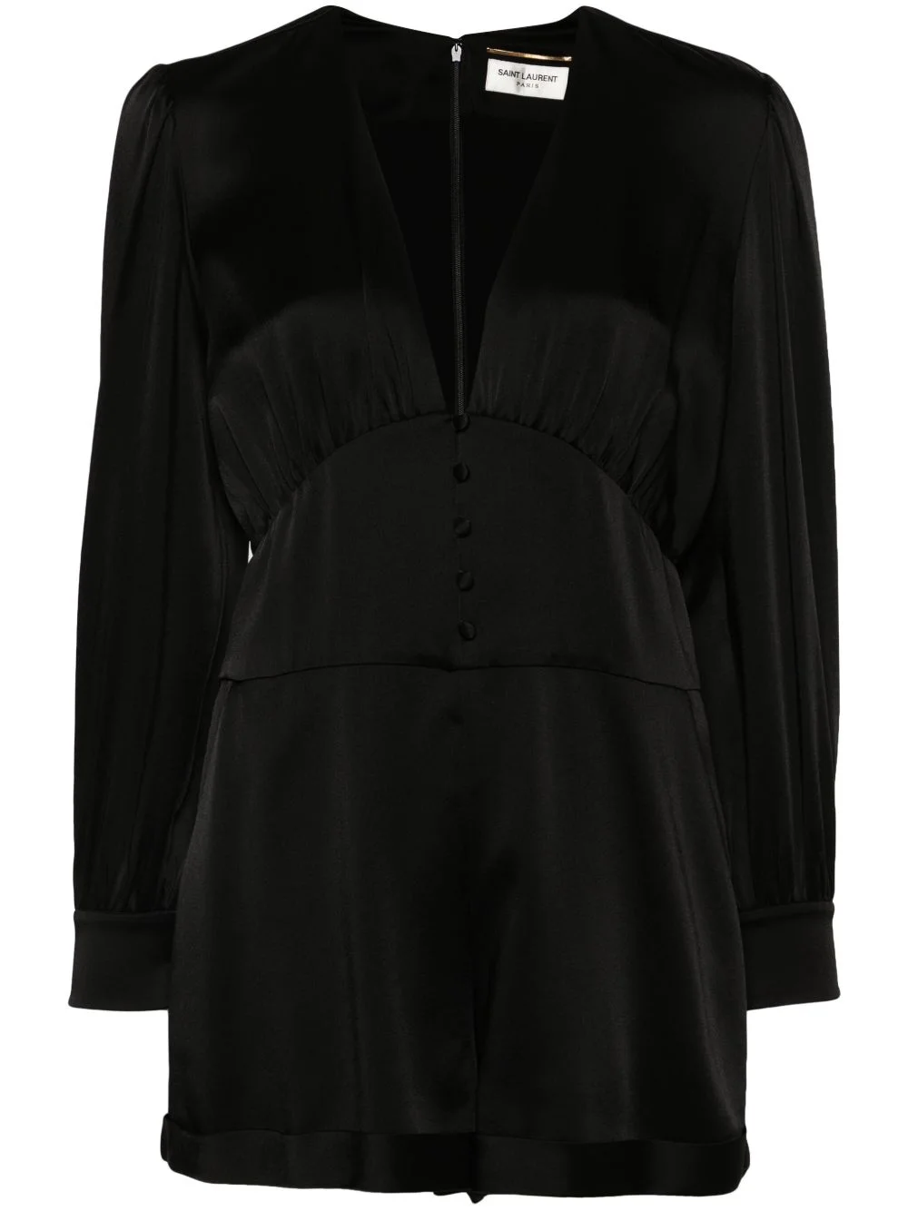 silk playsuit Saint Laurent's elegant style is showcased with this long-sleeve playsuit. Crafted in a slinky silk fabrication, the tonal design is defined by its plunging V-neck and long puff sleeves. Highlights - Black - Silk - Satin finish - Plunging v-neck - Front button fastening - Rear zip fastening - Long puff sleeves with buttoned cuffs - Two side slit pockets - Turn-up cuffs - Thigh-length Made in Italy Composition Outer: Acetate 52%, Viscose 48% Lining: Silk 100% SIZE & FIT Model measurements Height 5 ft 9 in(1.76 m) Bust/Chest 31.88 in(81 cm) Hips 35.43 in(90 cm) Waist 24.8 in(63 cm) Measurement INSIDE LEG 1.96 in(5 cm) HIPS 38.58 in(98 cm) FittingInformation Designed for a slim fit that sits just away from the body offering a close yet comfortable fit Made from a midweight non-stretch fabric This piece fits true to size – take your usual size Washing instructions Dry Clean Only