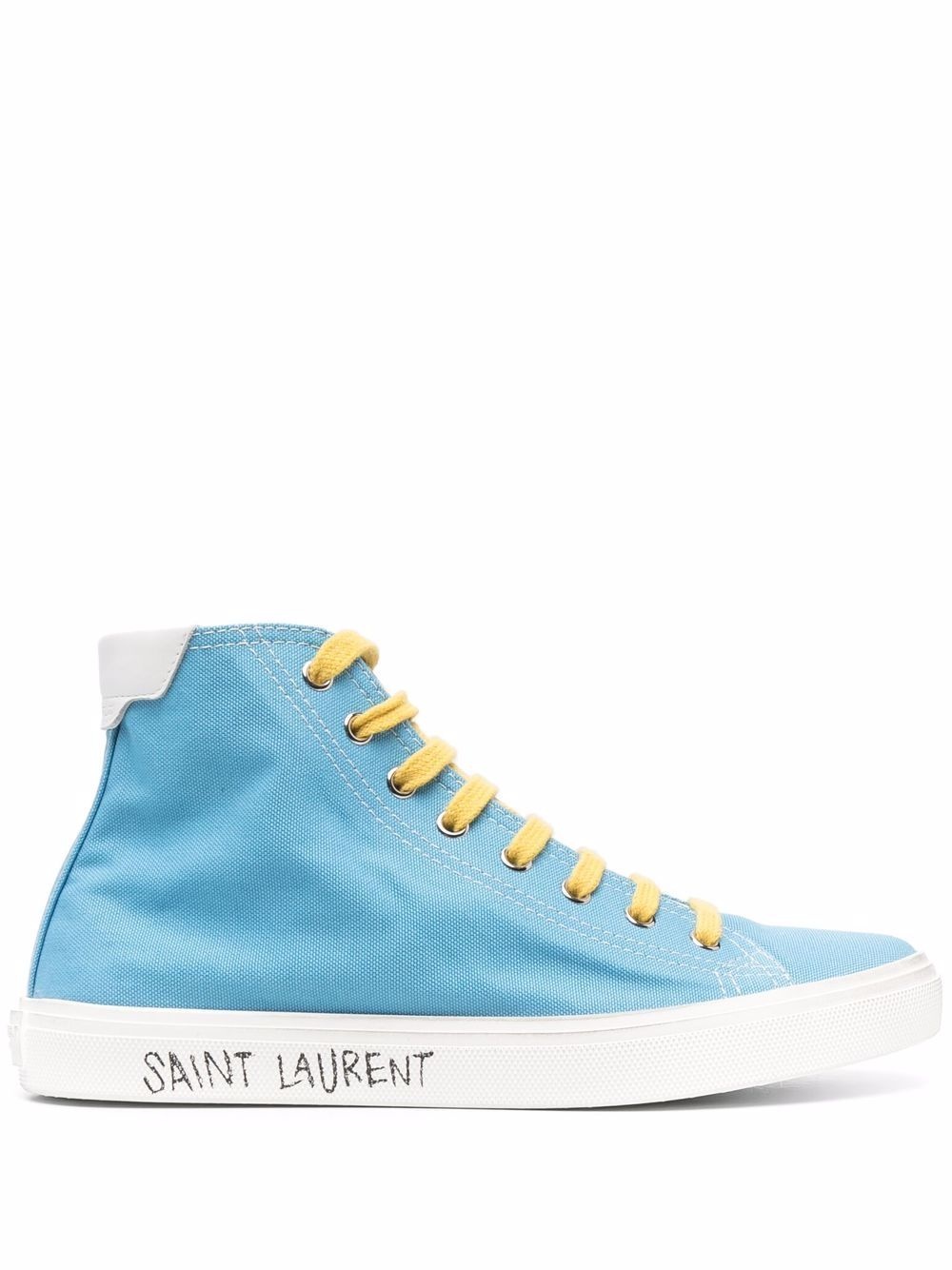 Malibu mid-top sneakers Saint Laurent combines Parisian nonchalance with Californian cool for these Malibu mid-top sneakers. Crafted from sky blue cotton canvas, these lace-up pair are detailed with a brand signature to the rubber sole and a logo-debossed heel counter in leather. Made in Italy Composition Sole: Rubber 100% Outer: Fabric 100% Lining: Fabric 100% SIZE & FIT Measurement HEEL 1.37 in(3.5 cm) HEIGHT 5.11 in(13 cm) Sole height 0.98 in(2.5 cm)