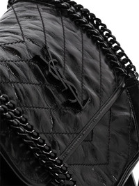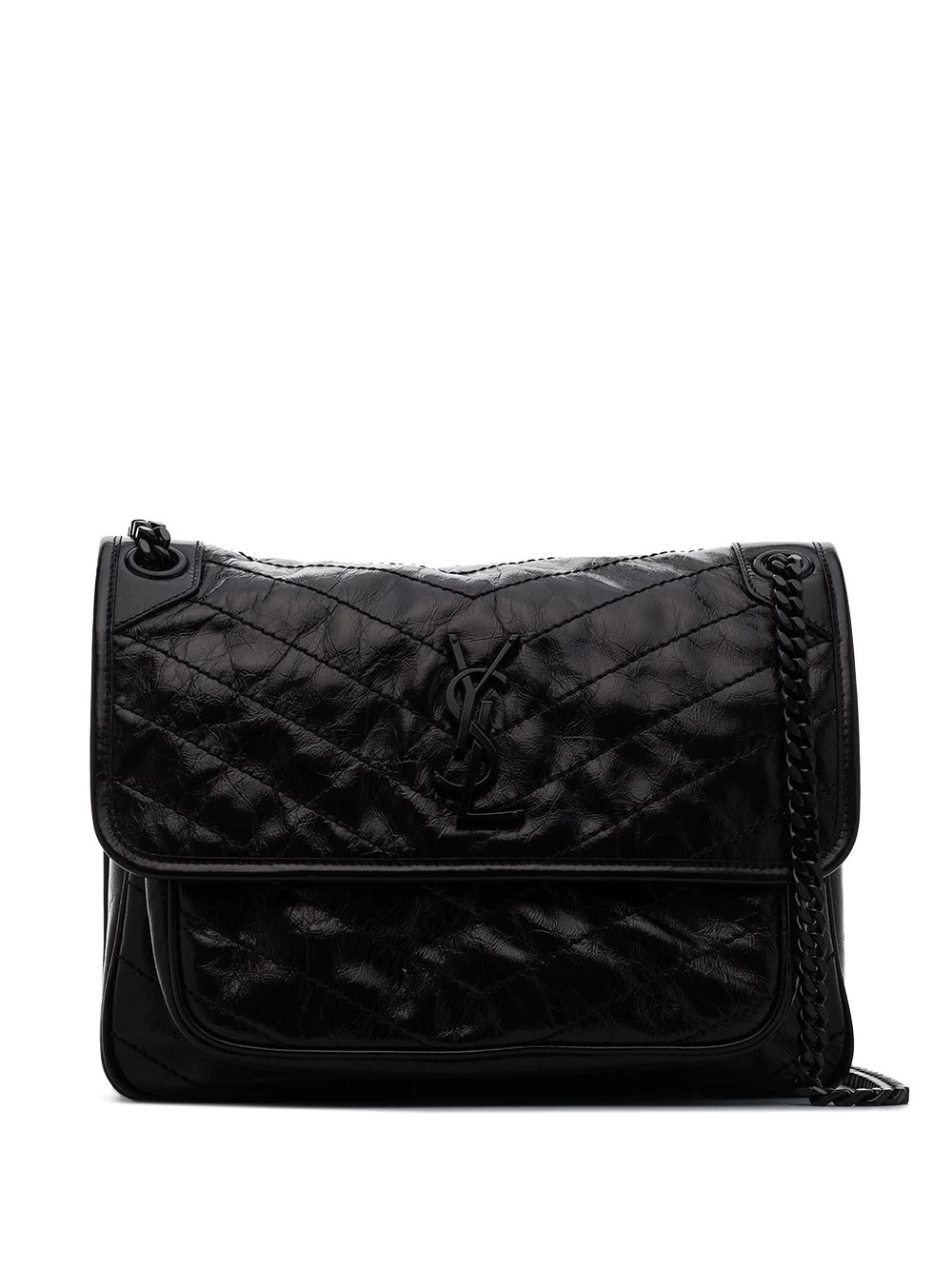 Niki chain strap bag Highlights - Black - Y quilting - Made from crinkled leather - Adjustable sliding chain and leather shoulder strap - Fold-over flap with magnetic fastening - Ysl logo plaque at front - Slip back pocket - Two main compartments - Grosgrain lining with zip and slip pockets - Tonal metal hardware crafted in italy Made in Italy Composition Bovine Leather (top grain) 100%, Brass 100%, Fabric 100% SIZE & FIT Model measurements Height 5 ft 10 in(1.77 m) Bust/Chest 34.64 in(88 cm) Hips 35.43 in(90 cm) Waist 26.37 in(67 cm) Measurement DEPTH 3.34 in(8.5 cm) HEIGHT 7.87 in(20 cm) STRAP 20.86 in(53 cm) WIDTH 11.02 in(28 cm)