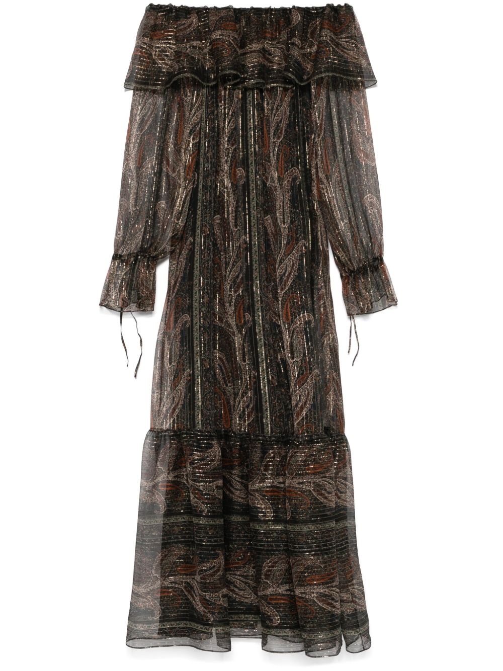 paisley muslin maxi dress Highlights - Black - One-shoulder - Long puff sleeves - Ruffle hem - Full lining Made in France Composition Outer: Silk 95%, Metallic Fibre 5% Lining: Silk 100% SIZE & FIT Model measurements Height 5 ft 10 in(1.78 m) Bust/Chest 33.46 in(85 cm) Hips 36.22 in(92 cm) Waist 23.22 in(59 cm) FittingInformation Designed to be unstructured, offering a loose fit throughout The elasticated shoulders offer movement and a comfortable fit Made from a lightweight non-stretch fabric Washing instructions Dry Clean Only